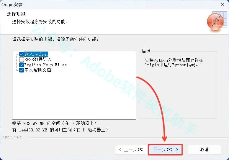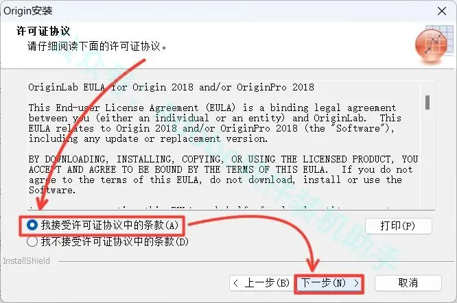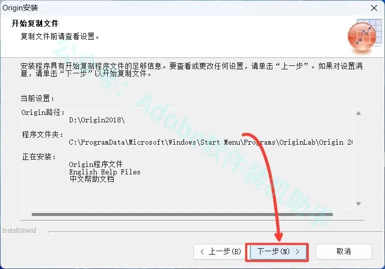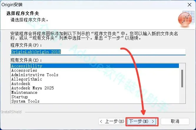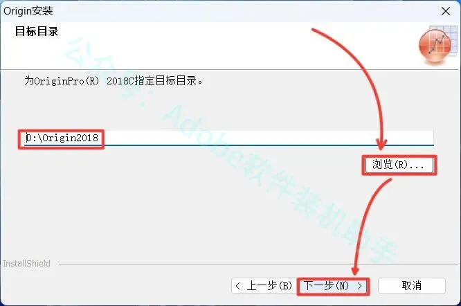 10.点击【浏览...】可更改安装位置(建议不要安装在C盘),可以在D盘或其它磁盘下新建一个“Origin2018”文件夹。(注:安装路径中不能有中文),点击【下一步】。