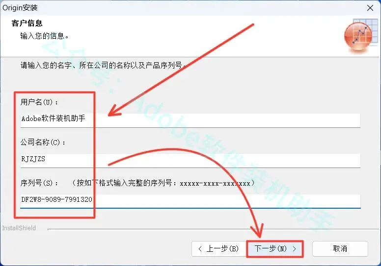 7.输入【用户名、公司名称】(可随便填写),输入序列号:DF2W8-9089-7991320,点击【下一步】。