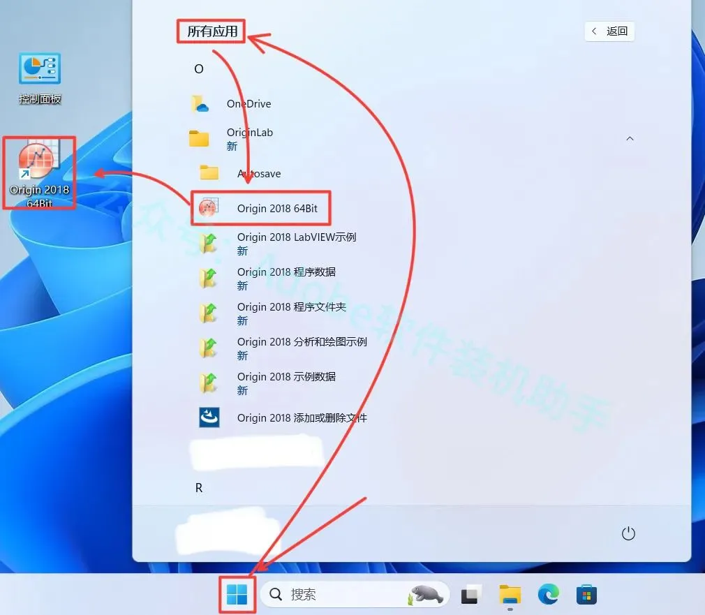 19.点击桌面左下角【开始】图标,点击【所有应用】,找到并拖动【Origin 2018 64Bit】图标到电脑桌面。