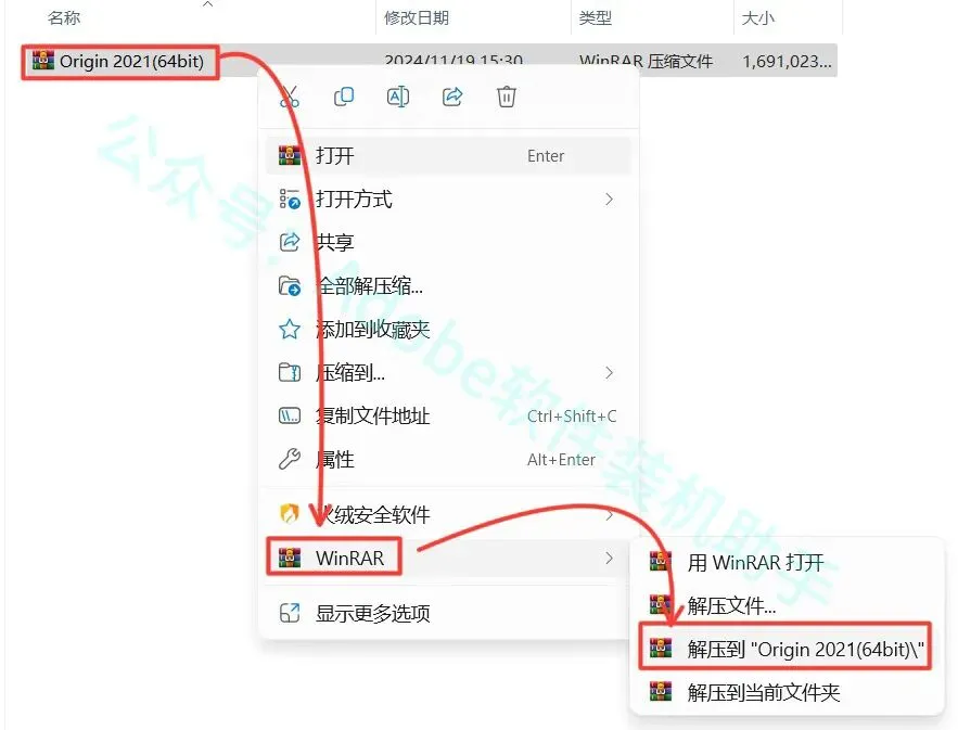 1.打开下载的Origin 2021安装包,鼠标右击压缩包选择【解压到 Origin 2021】。