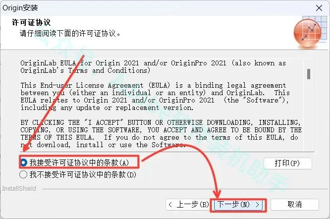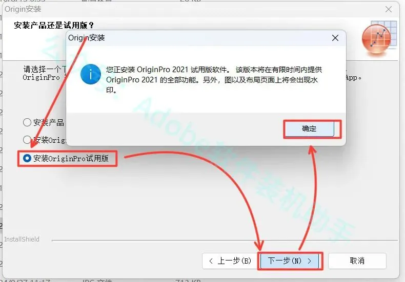 7.选择【安装OriginPro试用版】,点击【下一步】,点击【确定】。