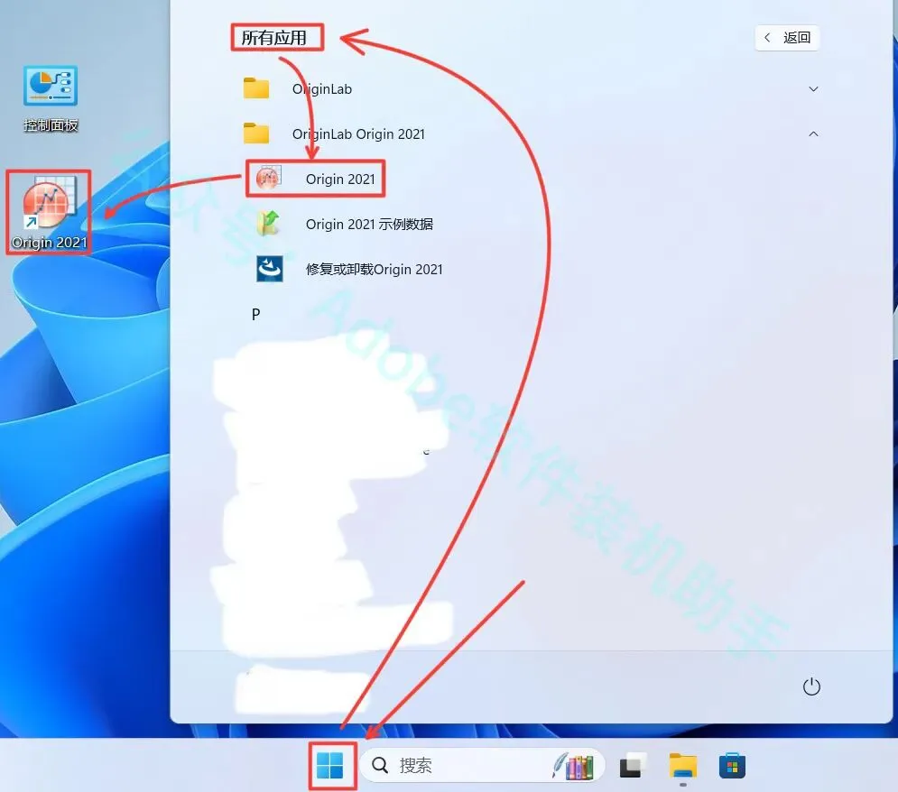 19.点击桌面左下角【开始】图标,点击【所有应用】,找到并拖动【Origin 2021】图标到电脑桌面。