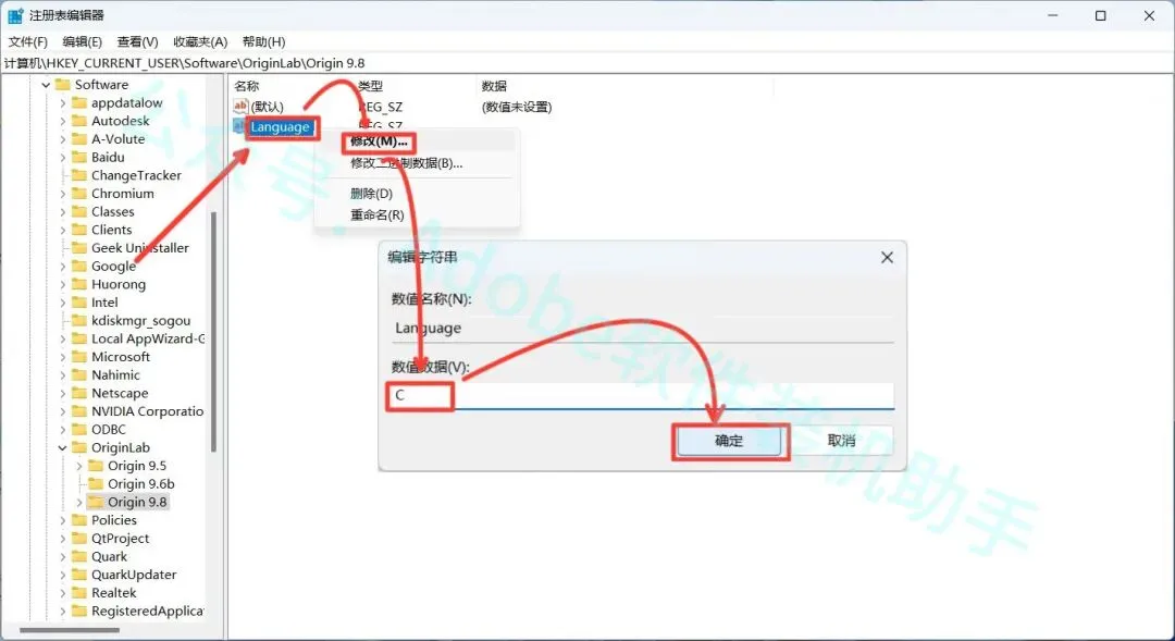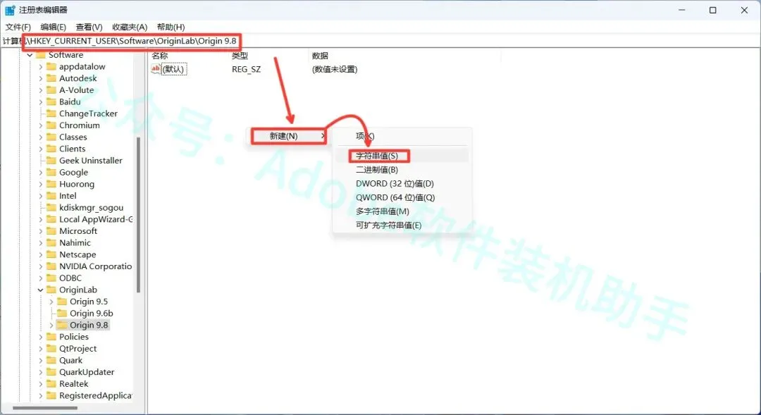 ②展开路径:HKEY_CURRENT_USER\Software\OriginLab\Origin 9.8,在右侧空白处鼠标右击选择【新建】,点击【字符串值】并将新建的文件名称更改为【Language】。