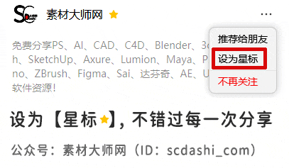 在本公众号:素材大师网(ID:scdashi_com),您可以免费获取常用的各类设计软件及相关设计素材源文件、办公常备、摄影摄像后期及各类网络实用工具,让各位设计师能够快速的找到想要的资源,节约更多的时间!