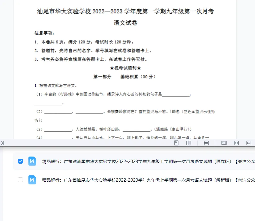 通过网盘分享的文件:【免费下载】精编广东省汕尾市华大实验学校20222023学年九年级上学期第一次月考语文试题