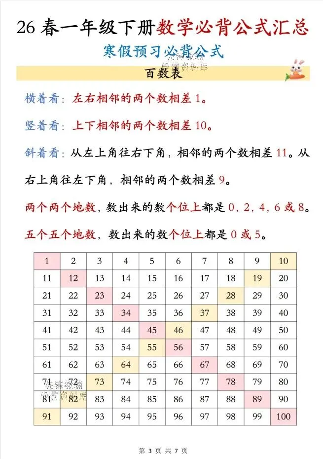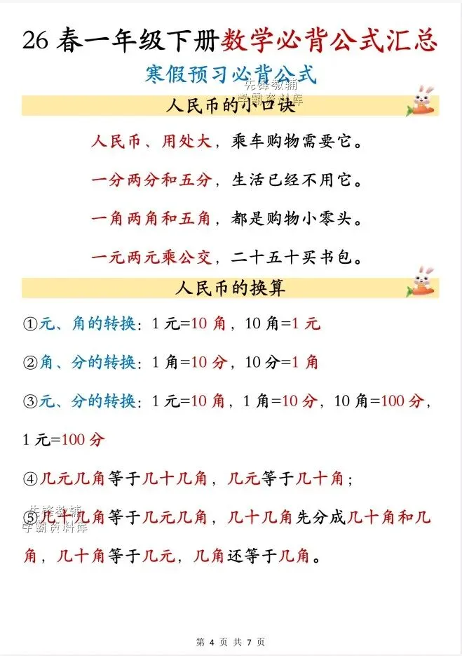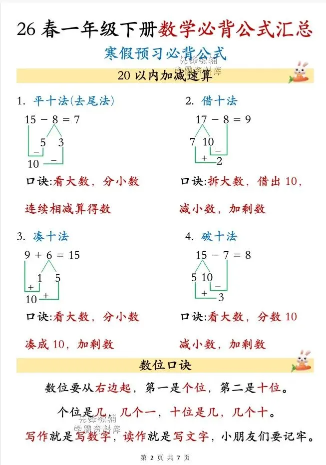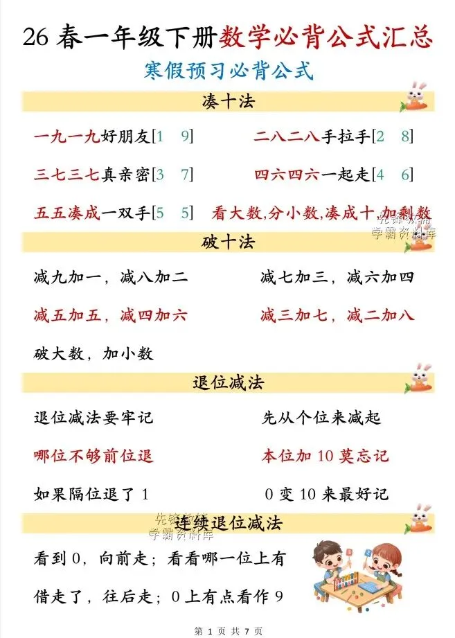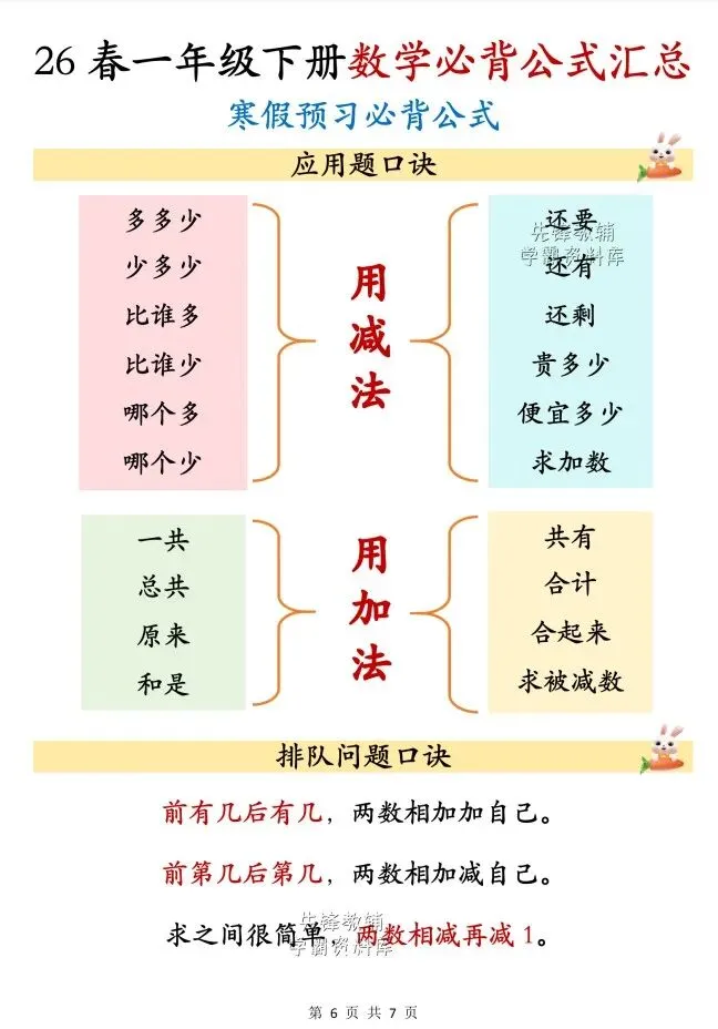 今天给大家整理了26春一年级数学下册必背公式汇总,转发给朋友或班级群,受益更多人,帮助孩子学习!