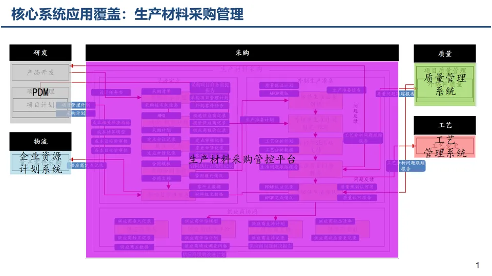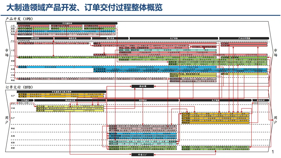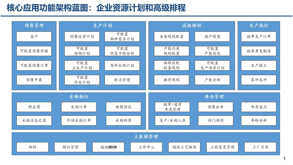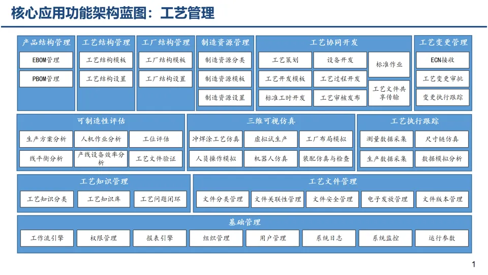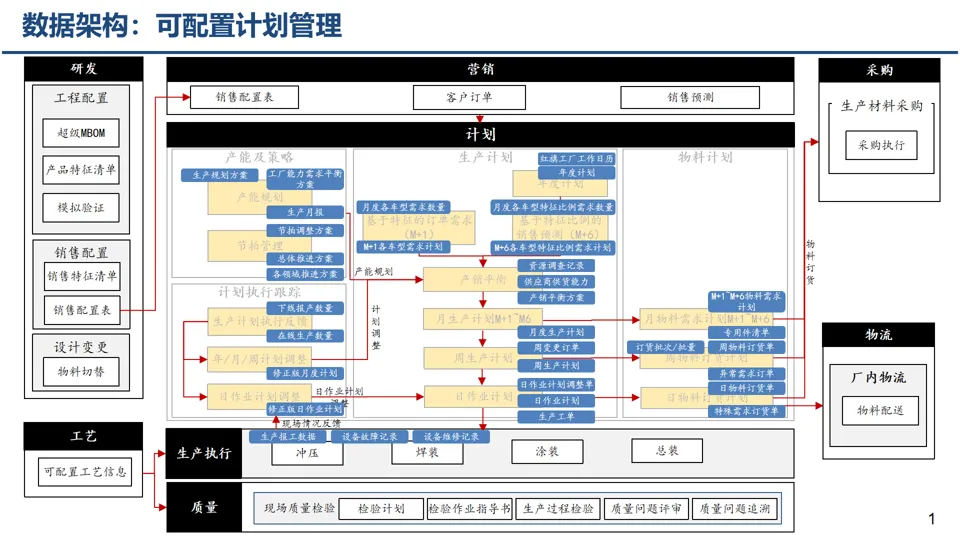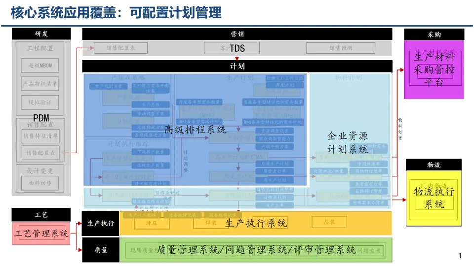 基于大制造核心业务过程,规划覆盖生态层、企业层、工厂层等多层级的应用系统,拉通产品研发、营销、制造全流程,避免 “断点、孤岛” 现象。
