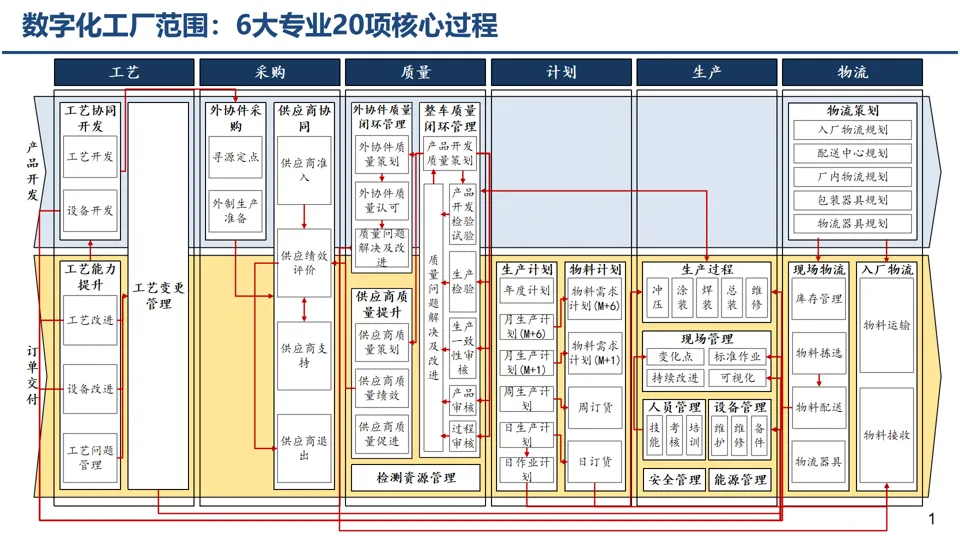 数字化工厂建设围绕大制造领域工艺、计划、生产、物流、采购、质量六大核心专业,拉通产品开发、订单交付两大核心业务过程。覆盖层级贯穿现场层、控制层、操作层、工厂管理层、企业管理层、生态协同层,以装备、网络、流程、系统、数据、技术为核心构建数字化能力,实现从自动化、信息化向数字化、智能化的迈进。