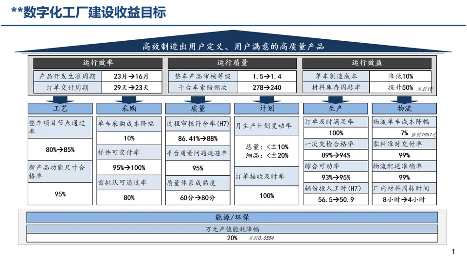 运行效率上,产品开发生准周期从 23 月压缩至 16 月,订单交付周期从 29 天缩短至 23 天;运行质量上,整车产品审核等级从 1.5 提升至 1.4,千台车索赔频次从 278 降至 240;运行效益上,单车制造成本降低 10%,材料库存周转率提升 50%,覆盖生产、采购、物流等多领域关键指标改善。