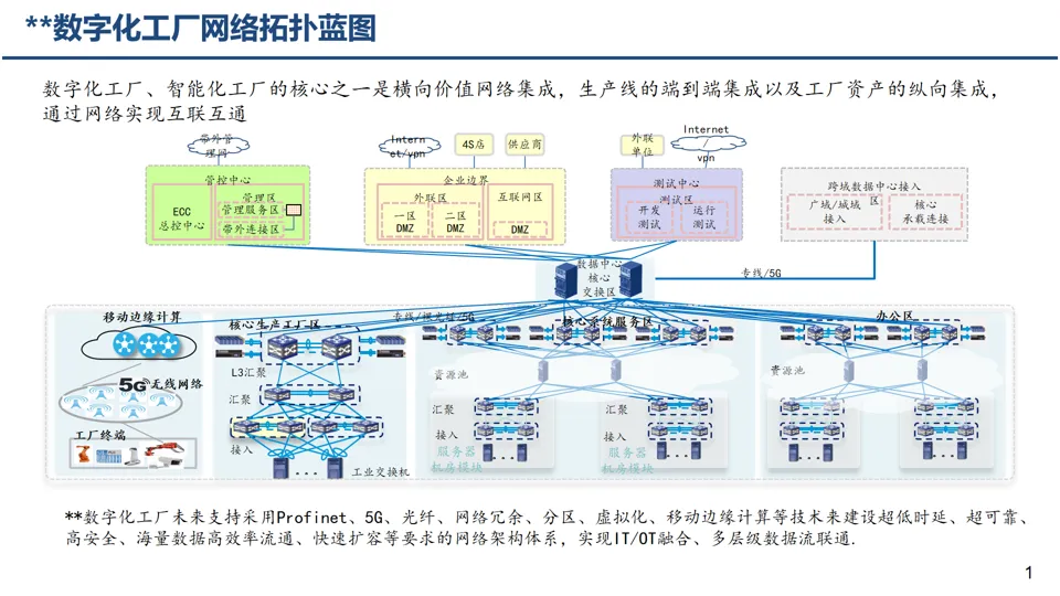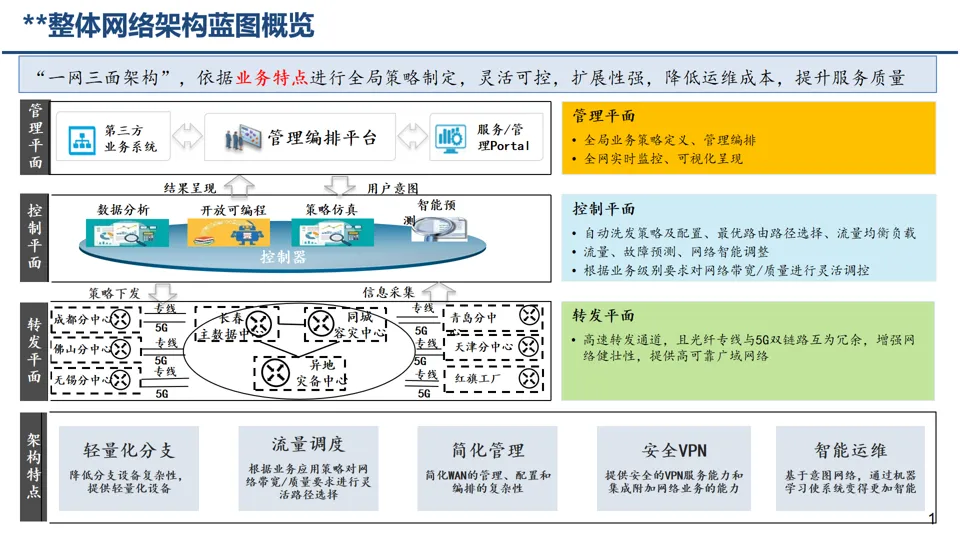 采用 “一网三面架构”,通过管理平面、控制平面、转发平面实现全局管控,结合 5G、光纤专线等技术,打造低时延、高可靠的网络体系,支撑 IT/OT 融合。