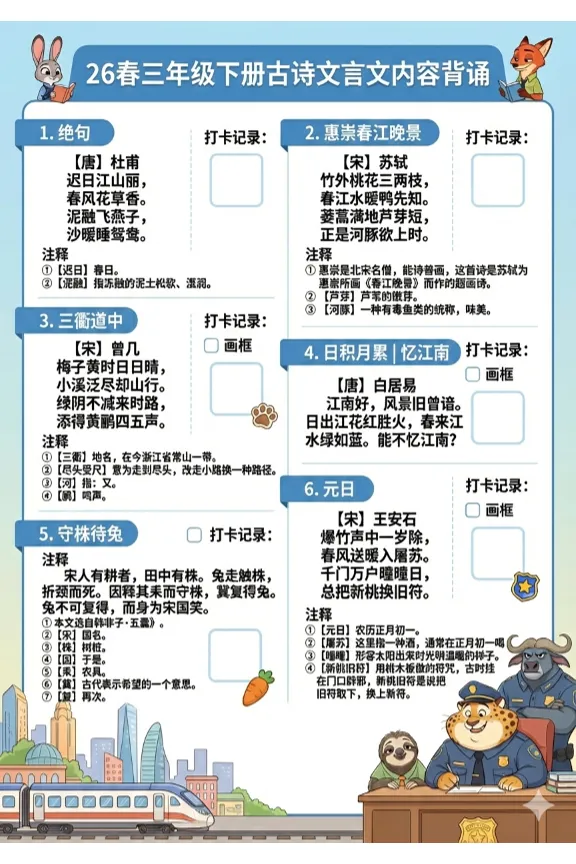 【免费下载】三年级(下)语文 新版必备内容打卡表-疯狂动物城,PDF电子版,共6页,可打印