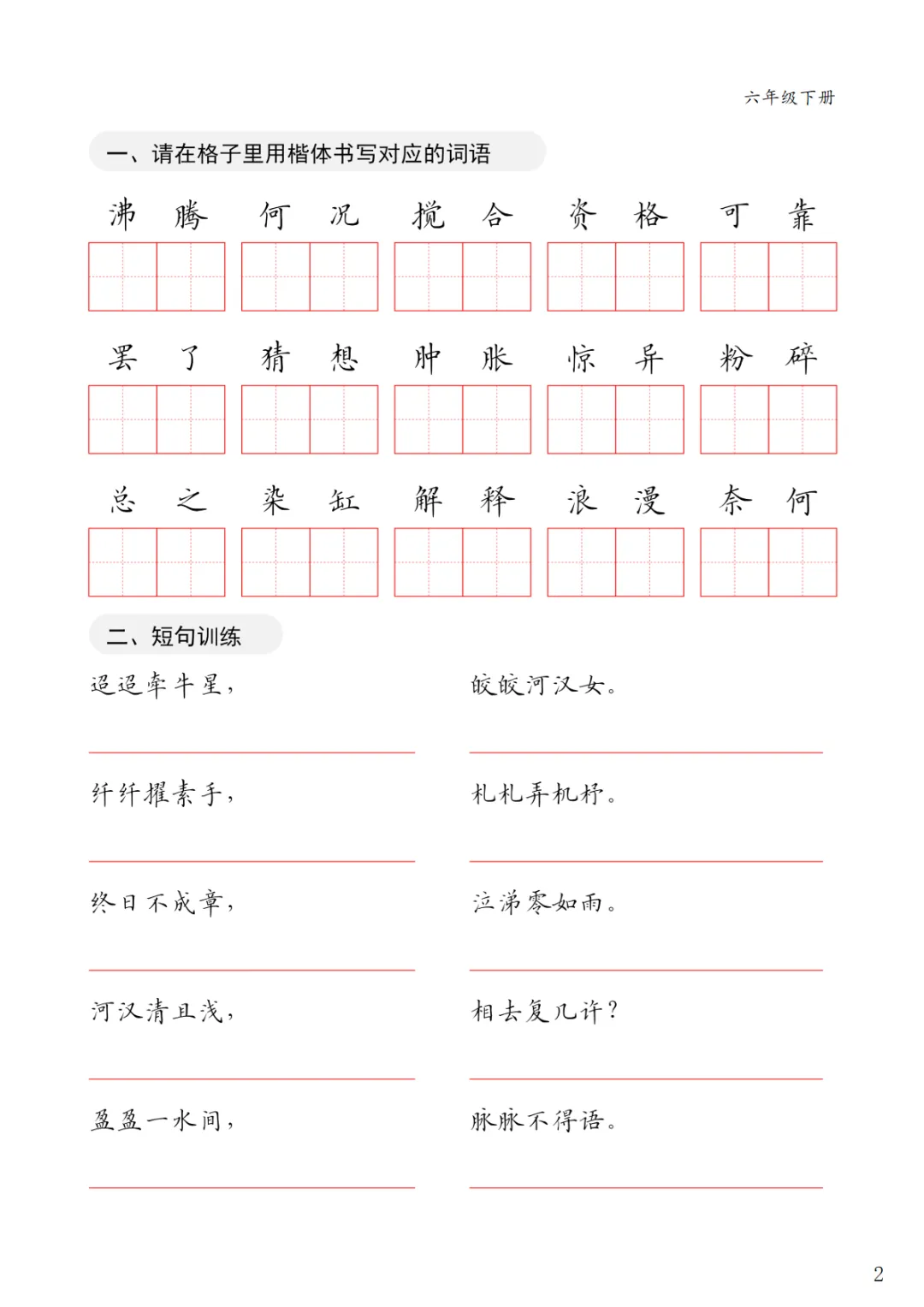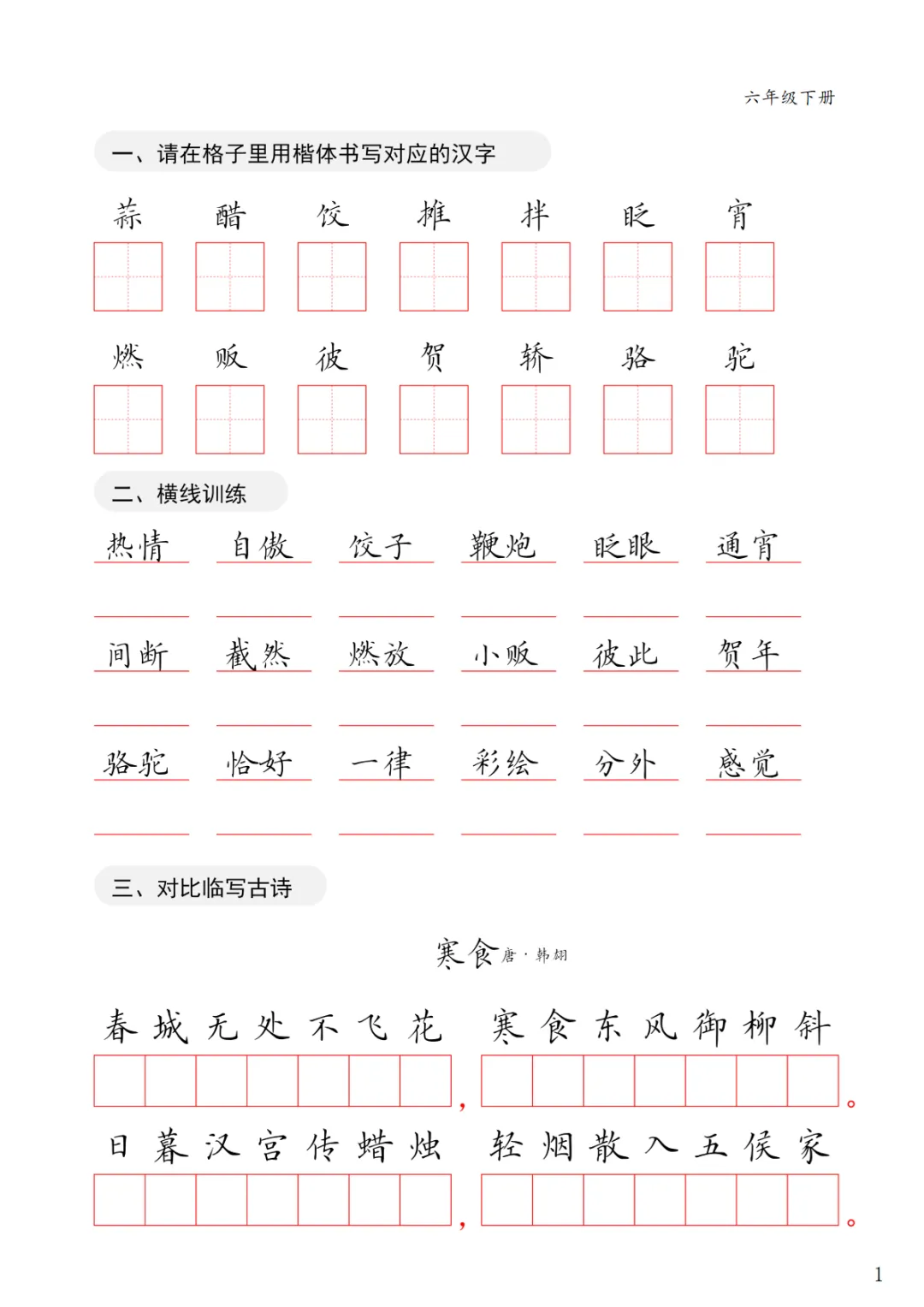 【免费下载】六年级(下)语文 卷面练习字帖,PDF电子版,共20页,可打印