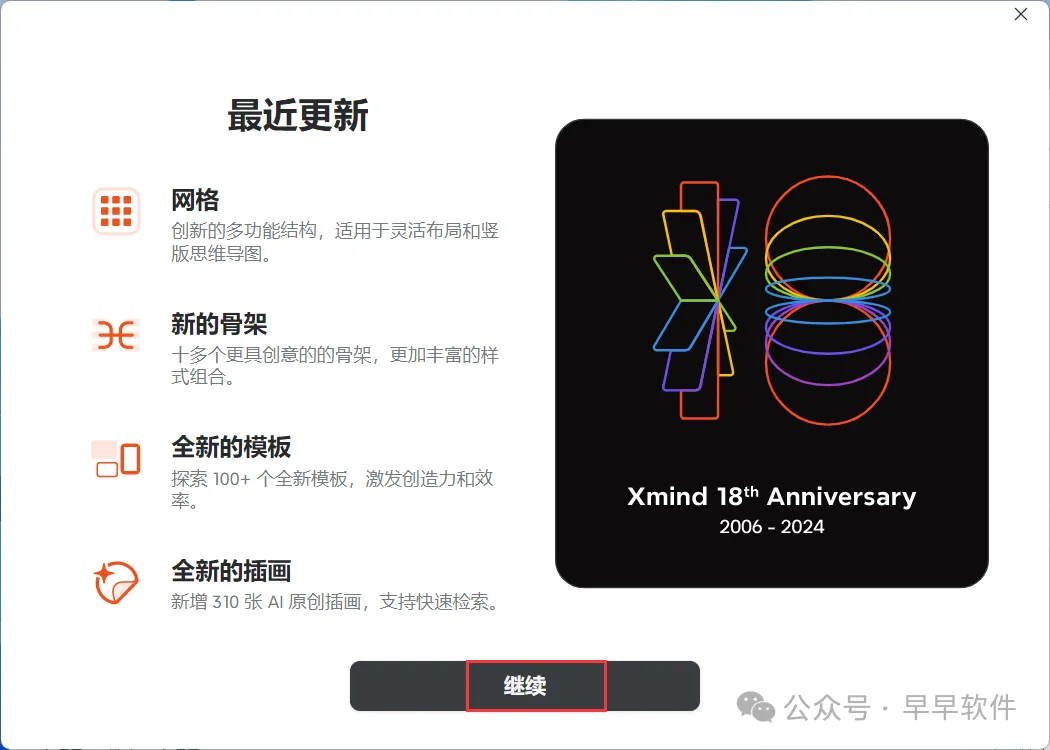 5、软件安装成功,Xmind 2025会自动打开,点击【继续】