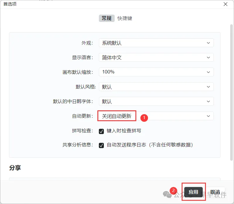 15、自动更新选择【关闭自动更新】,再点击【应用】
