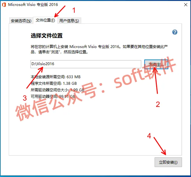 6,点文件位置选项,然后点浏览可以更改安装位置,本教程以D盘为例,在D盘新建Visio2016文件夹。然后点立即安装