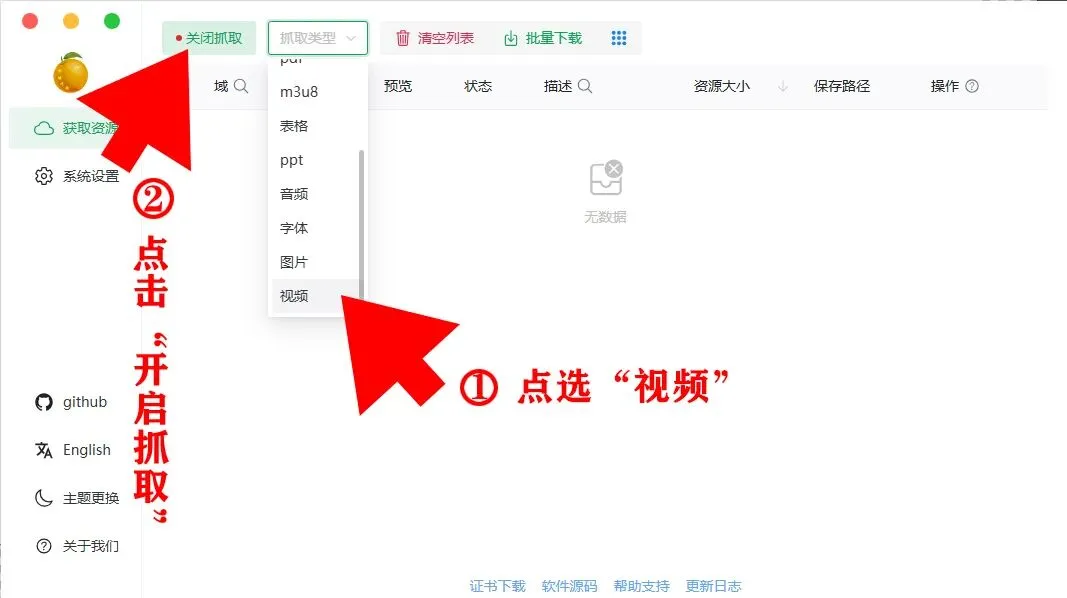 视频➨抓取:软件界面如下,点击开始抓取,并将抓取类型设置为视频。下图为已点击“开启抓取”后的页面。