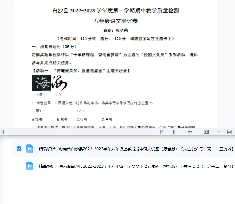 通过网盘分享的文件:【免费下载】精编海南省白沙县20222023学年八年级上学期期中语文试题