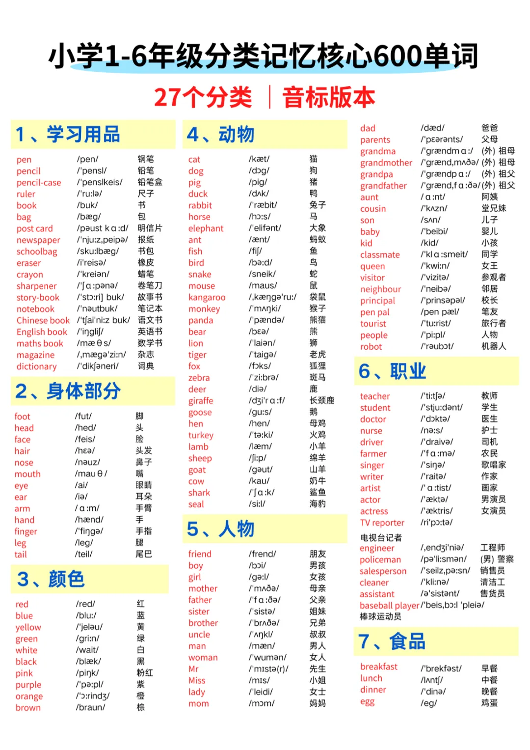 六年级(下)英语 1-6年级分类记忆核心600单词