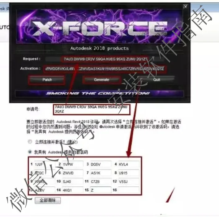 18.打开“注册机”,选中“xf-adsk2018_x64”,“并以管理员身份运行”。19.把申请号复制到注册机里的“Request”里,先点“patch”,再点“确定”,然后点“Generate”后复制“Activate”中生成的激活码,然后粘贴至“我具有Autodesk提供的激活码”的方框中,最后点“下一步”。