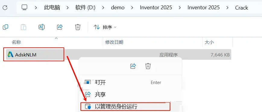 7、打开安装包里的crack文件夹,以管理员身份运行AdskNLM
