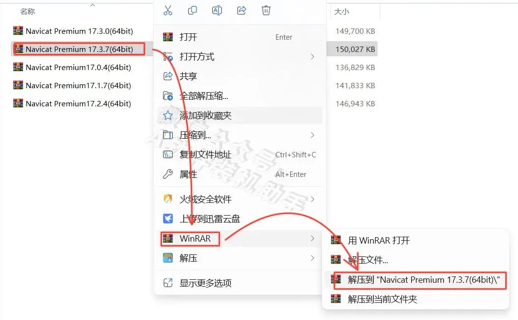 1.打开下载的Navicat Premium 17.3.7(64bit)安装包,鼠标右击压缩包选择【解压到Navicat Premium 17.3.7(64bit)\】。