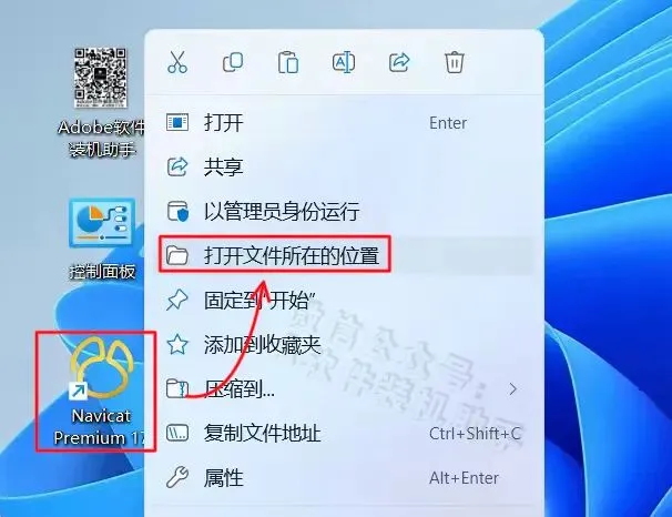 13.鼠标右击桌面【Navicat Premium17】图标,选择【打开文件所在的位置】。