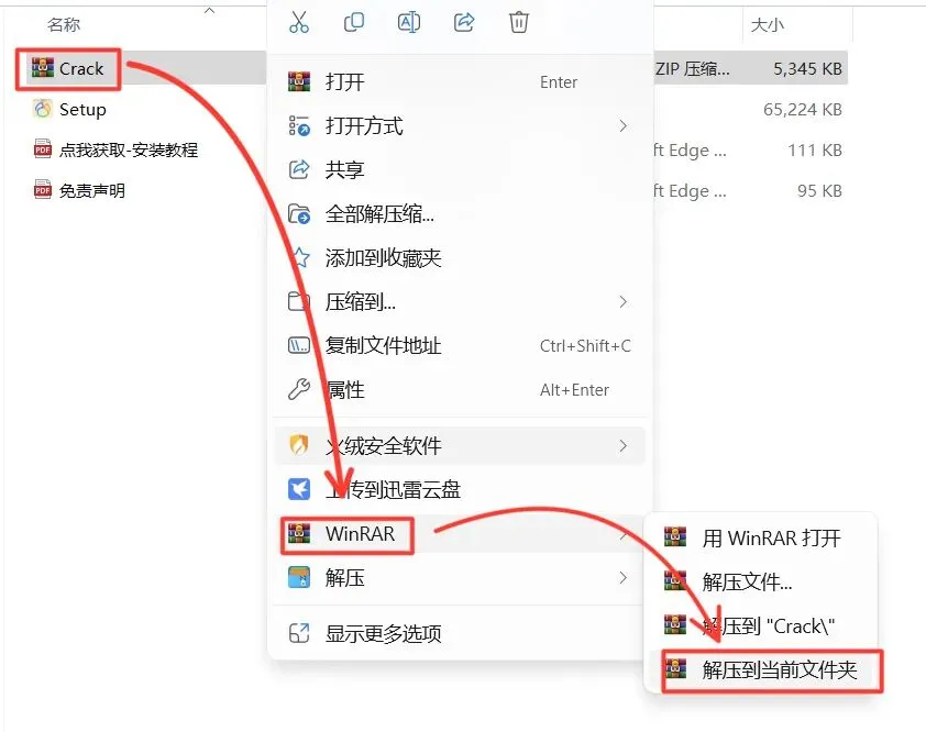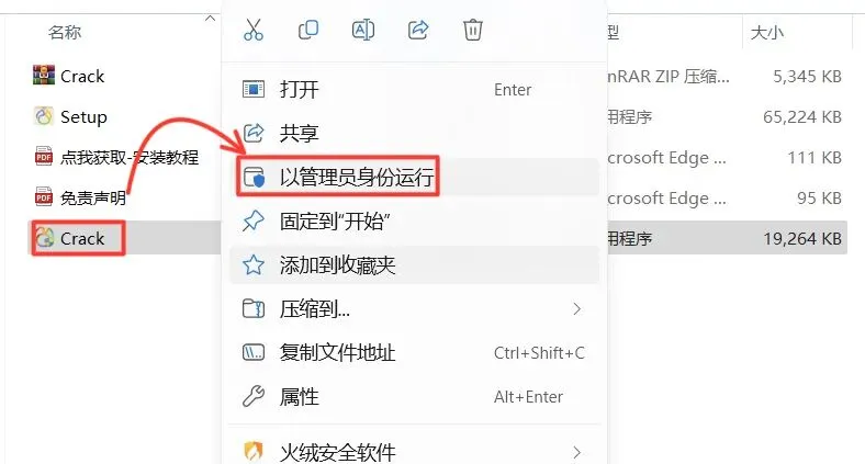 13.鼠标右击解压出来的【Crack】,选择【以管理员身份运行】。