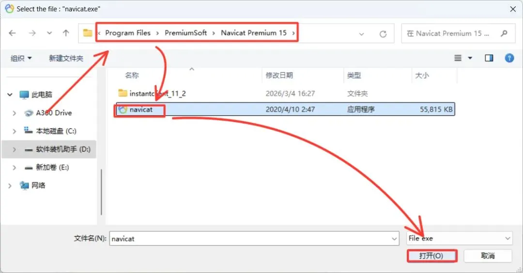 15.选择安装路径根目录下的【navicat】(参考步骤6更改的磁盘位置路径),选择【打开】。