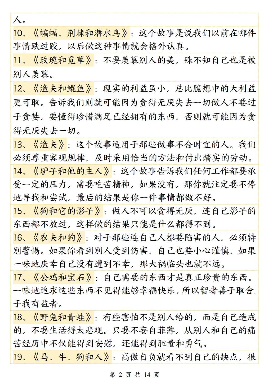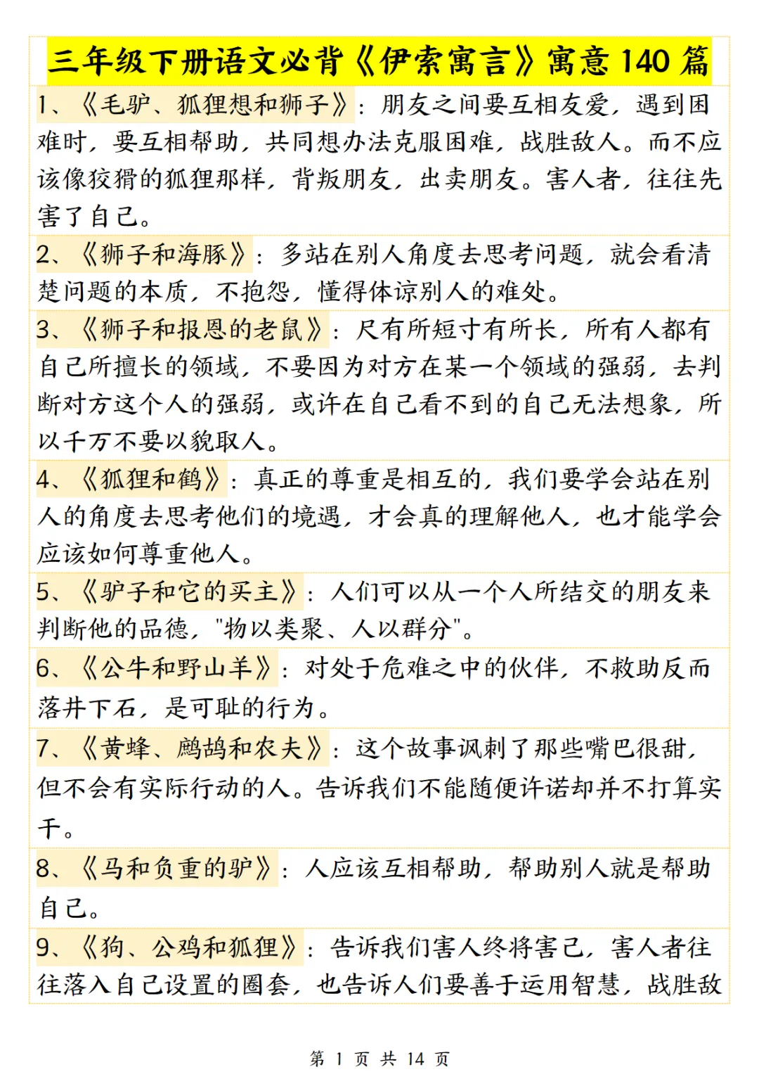 【免费下载】三年级(下)语文 必背《伊索寓言》寓意140篇,PDF电子版,共14页,可打印