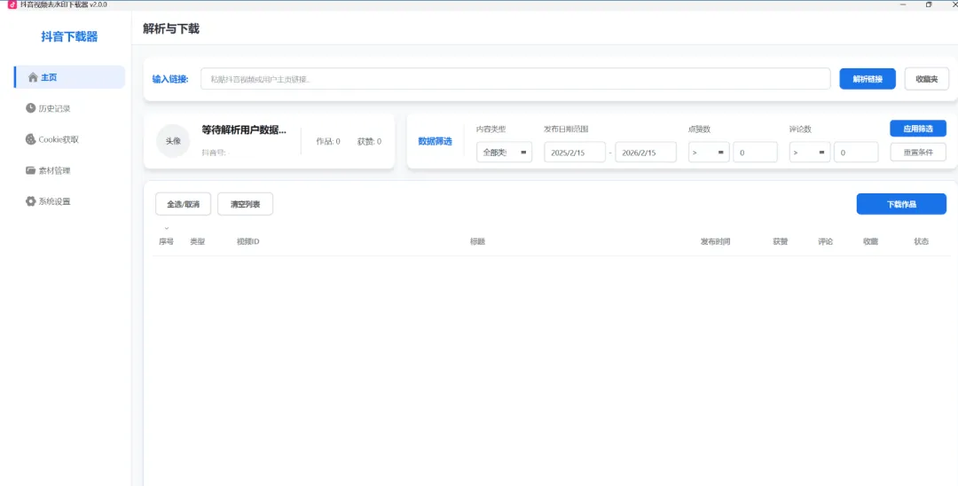 仅需粘贴抖音用户主页链接,即可一键获取该账号所有公开视频 / 图文资源,自动批量完成解析 + 去水印 + 下载全流程,无需逐条复制链接操作,省时省力,效率直接拉满。