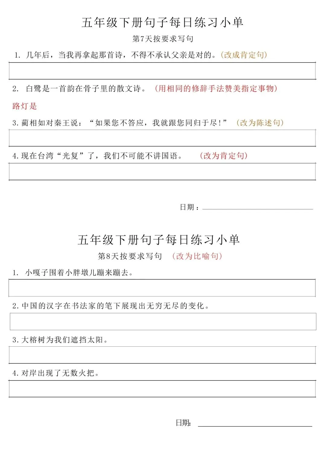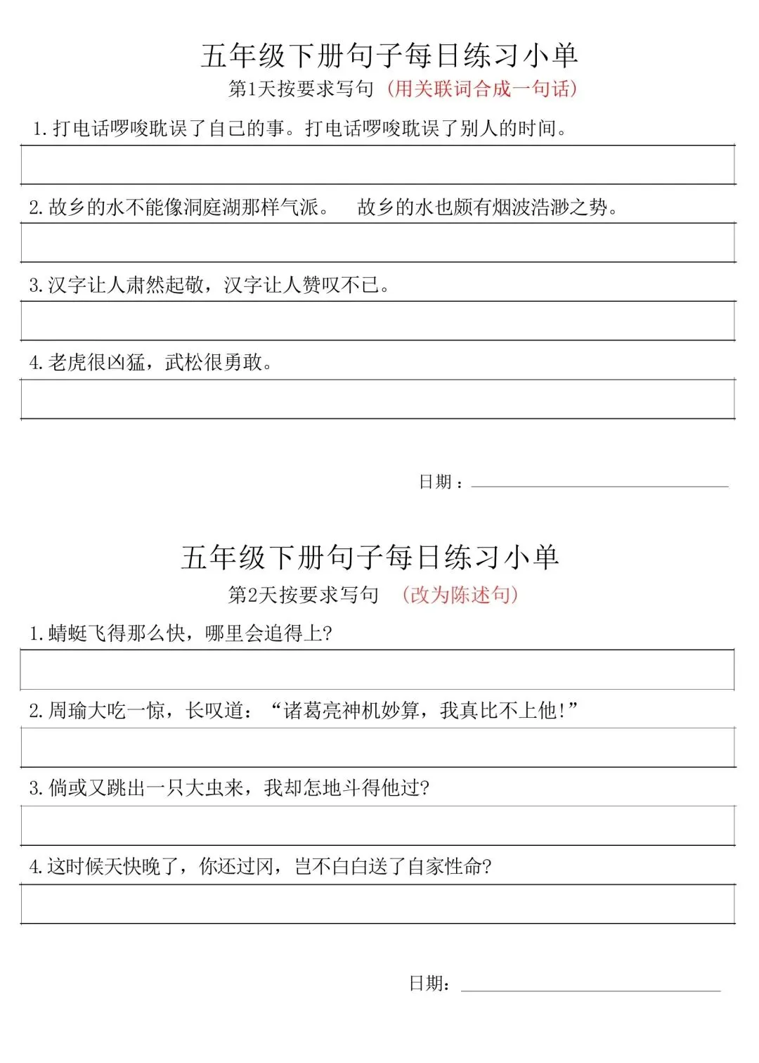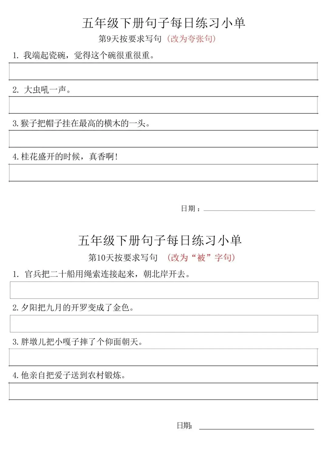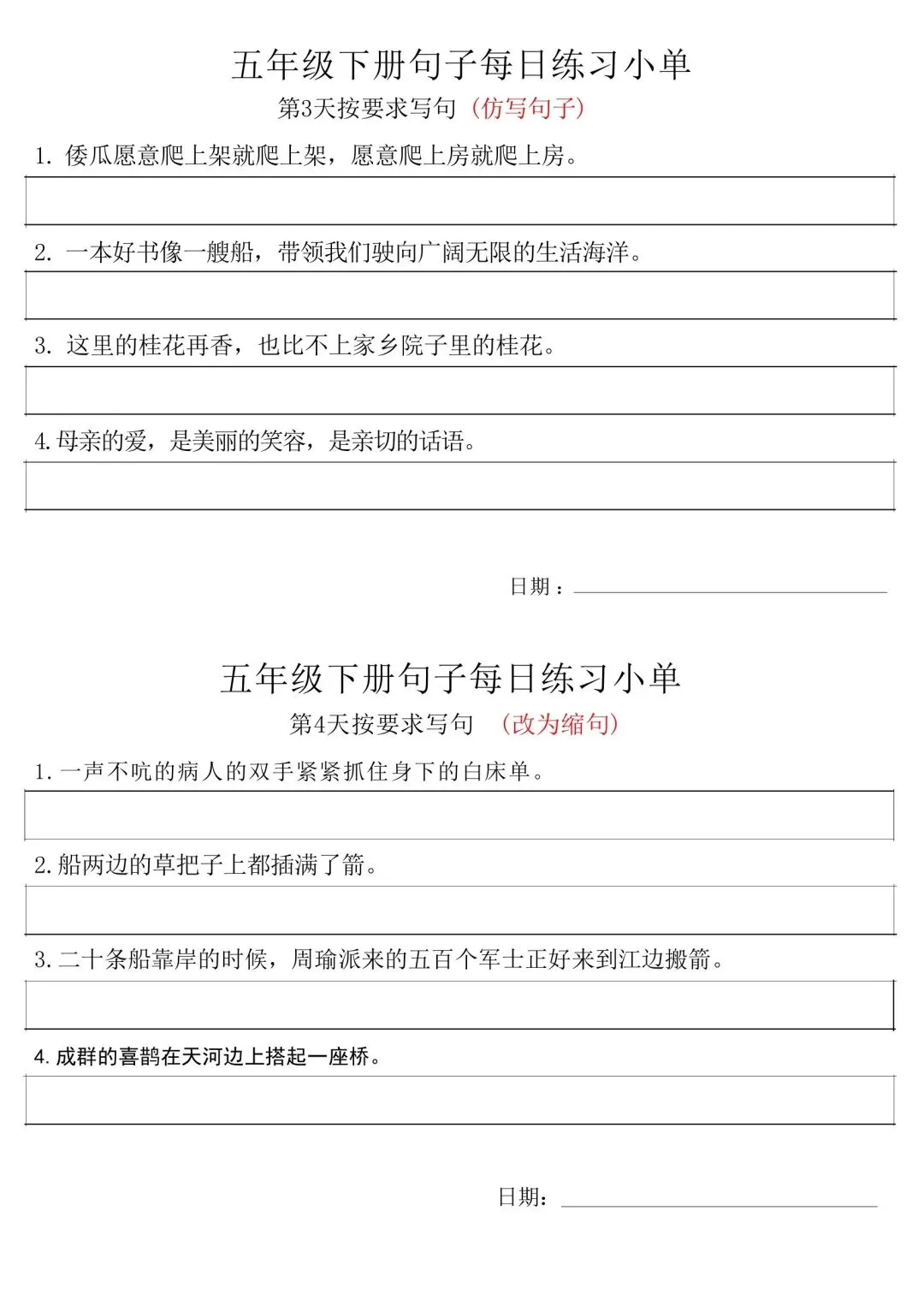 五年级下册语文每日句子练习单,家长可免费下载打印出来,帮助孩子学习,完整高清电子版,下载方式见文末。