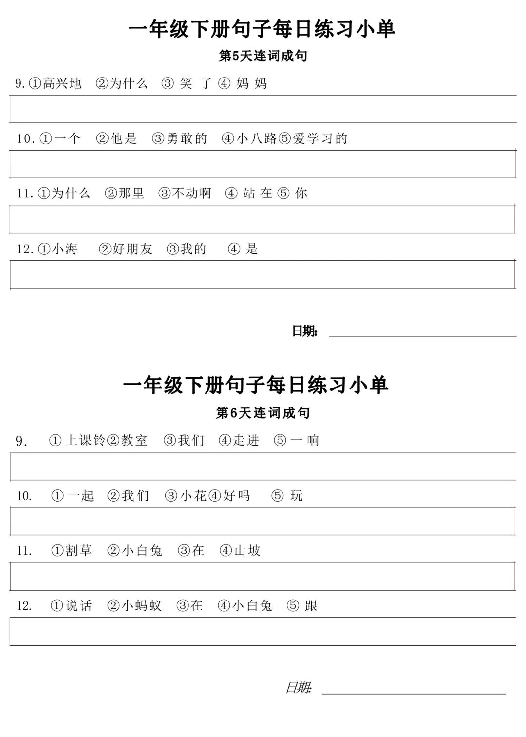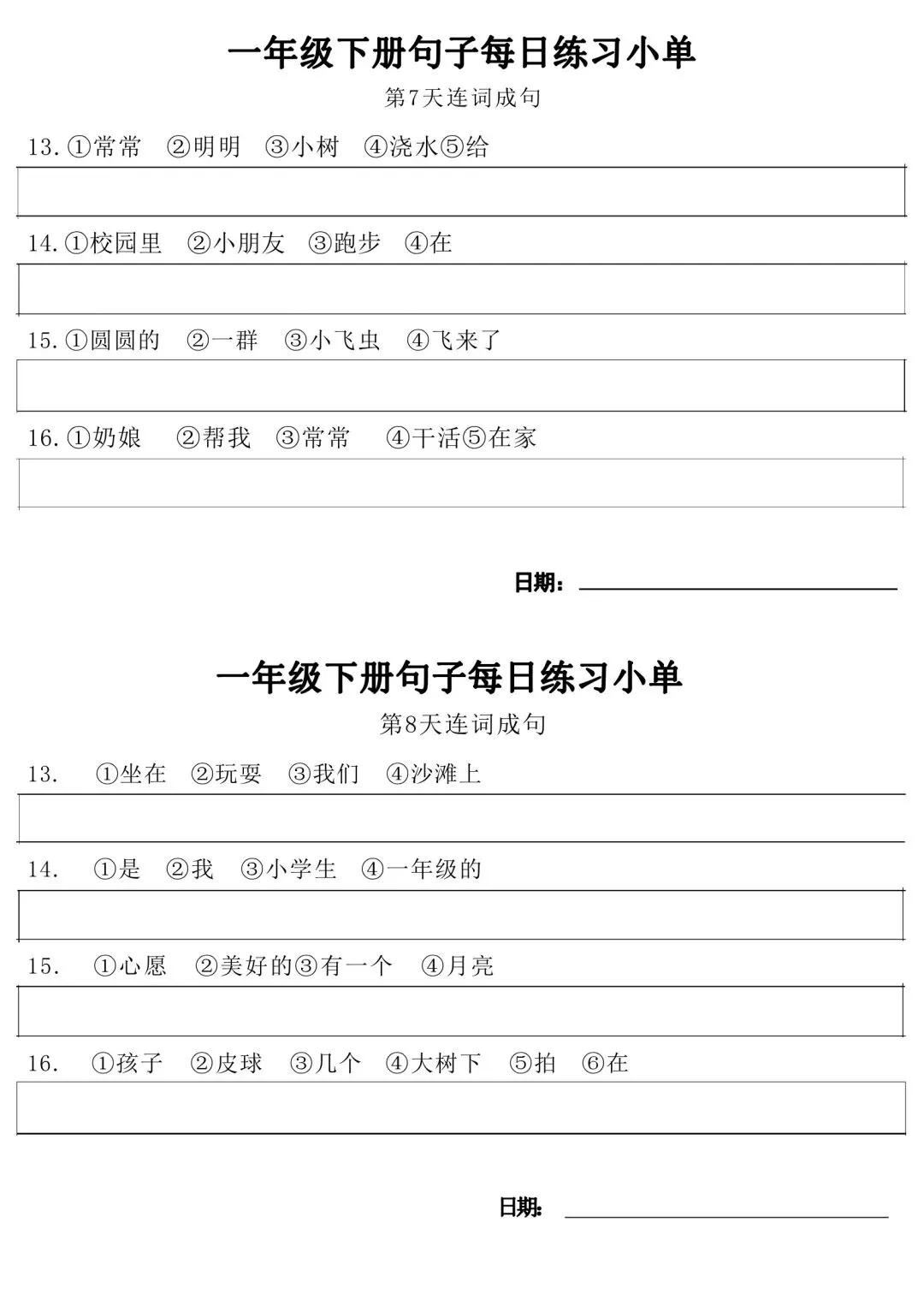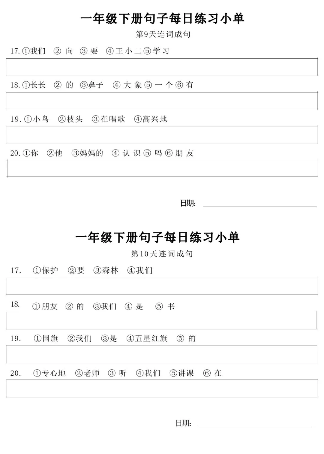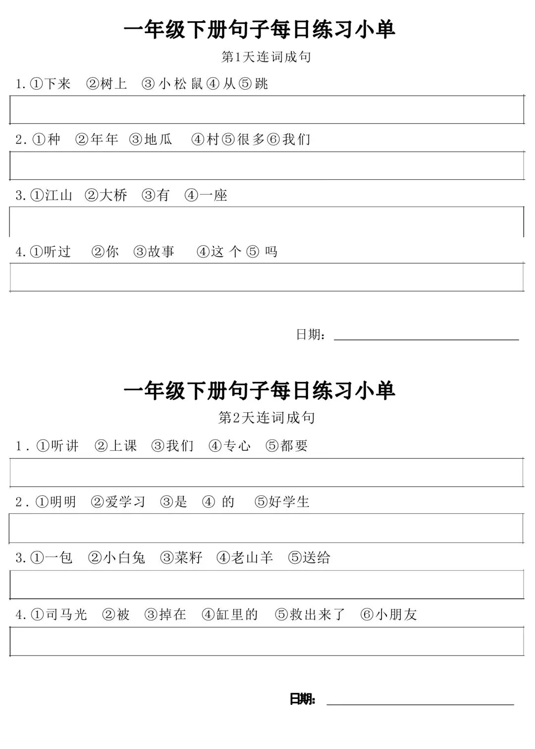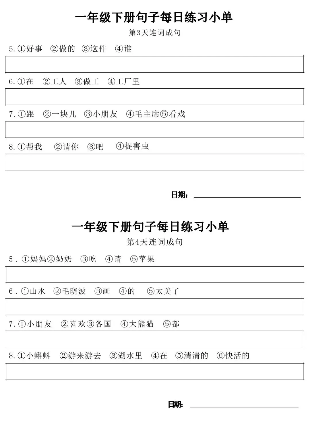 一年级下册语文每日句子练习单,家长可免费下载打印出来,帮助孩子学习,完整高清电子版,下载方式见文末。