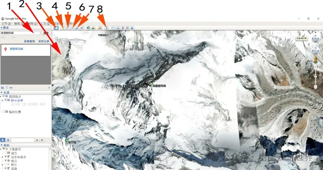 谷歌地球主窗口中提供的一些功能: