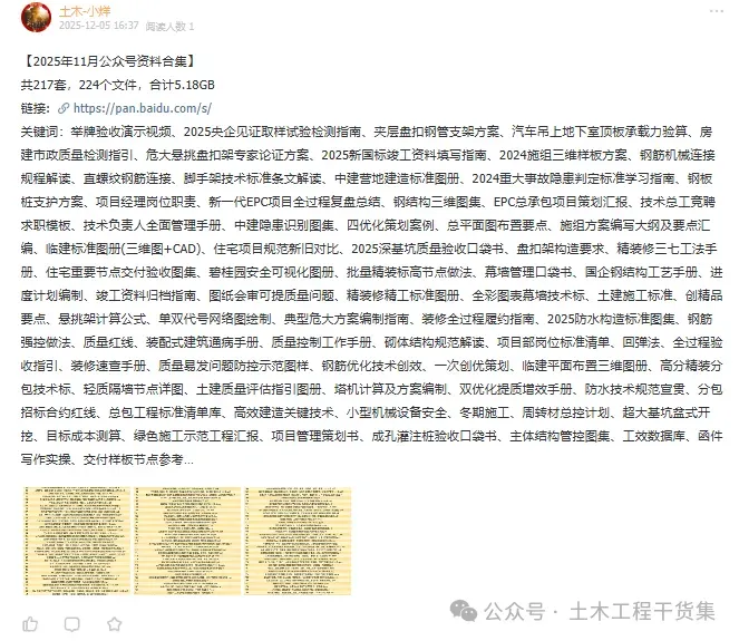 包含举牌验收演示视频、2025央企见证取样试验检测指南、夹层盘扣钢管支架方案、汽车吊上地下室顶板承载力验算、房建市政质量检测指引、危大悬挑盘扣架专家论证方案、2025新国标竣工资料填写指南、2024施组三维样板方案、钢筋机械连接规程解读、直螺纹钢筋连接、脚手架技术标准条文解读、中建营地建造标准图册、2024重大事故隐患判定标准学习指南、钢板桩支护方案、项目经理岗位职责、新一代EPC项目全过程复盘总结、钢结构三维图集、EPC总承包项目策划汇报、技术总工竞聘求职模板、技术负责人全面管理手册、中建隐患识别图集、四优化策划案例、总平面图布置要点、施组方案编写大纲及要点汇编、临建标准图册(三维图+CAD)、住宅项目规范新旧对比、2025深基坑质量验收口袋书、盘扣架构造要求、精装修三七工法手册、住宅重要节点交付验收图集、碧桂园安全可视化图册、批量精装标高节点做法、幕墙管理口袋书、国企钢结构工艺手册、进度计划编制、竣工资料归档指南、图纸会审可提质量问题、精装修精工标准图册、全彩图表幕墙技术标、土建施工标准、创精品要点、悬挑架计算公式、单双代号网络图绘制、典型危大方案编制指南、装修全过程履约指南、2025防水构造标准图集、钢筋强控做法、质量红线、装配式建筑通病手册、质量控制工作手册、砌体结构规范解读、项目部岗位标准清单、回弹法、全过程验收指引、装修速查手册、质量易发问题防控示范图样、钢筋优化技术创效、一次创优策划、临建平面布置三维图册、高分精装分包技术标、轻质隔墙节点详图、土建质量评估指引图册、塔机计算及方案编制、双优化提质增效手册、防水技术规范宣贯、分包招标合约红线、总包工程标准清单库、高效建造关键技术、小型机械设备安全、冬期施工、周转材总控计划、超大基坑盆式开挖、目标成本测算、绿色施工示范工程汇报、项目管理策划书、成孔灌注桩验收口袋书、主体结构管控图集、工效数据库、函件写作实操、交付样板节点参考…