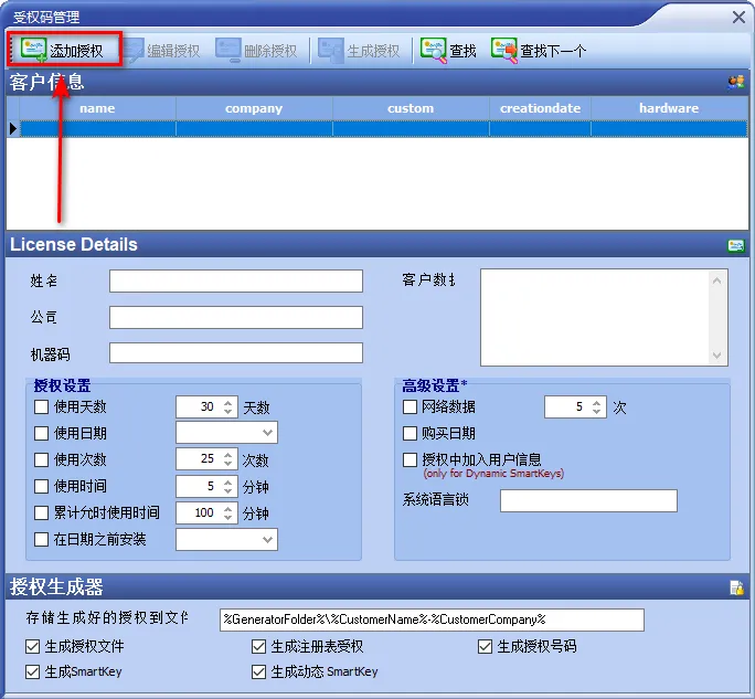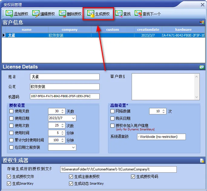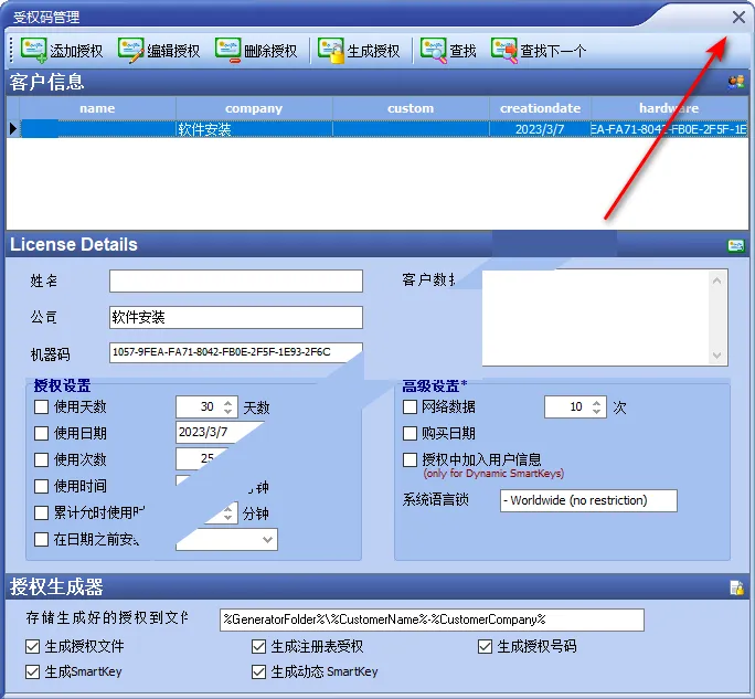 18、Customer输入:大叔,Company输入:软件安装,将机器码输入到Hardware输入框中,点击“Save”