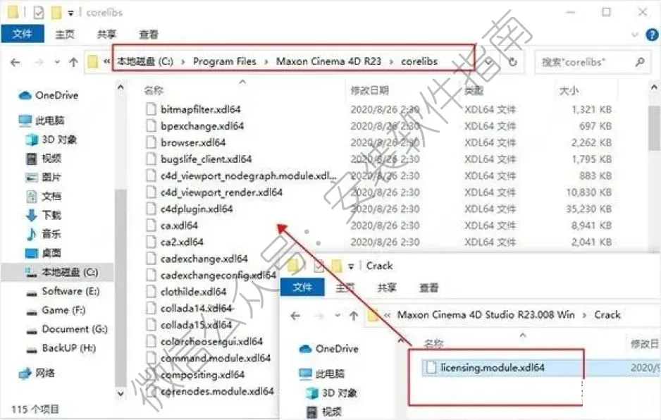 6、返回刚开始解压出来的文件夹里,复制Crack文件夹里面的文件,到以下目录中替换;目录:C:\Program Files\Maxon Cinema 4D R23\corelibs