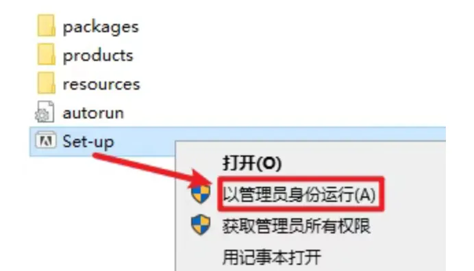 在解压后的文件夹中找到Set-up 安装程序,找不到setup的话关闭杀毒重新解压,鼠标右键选择以管理员身份运行。