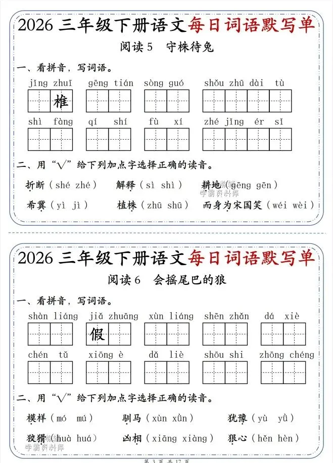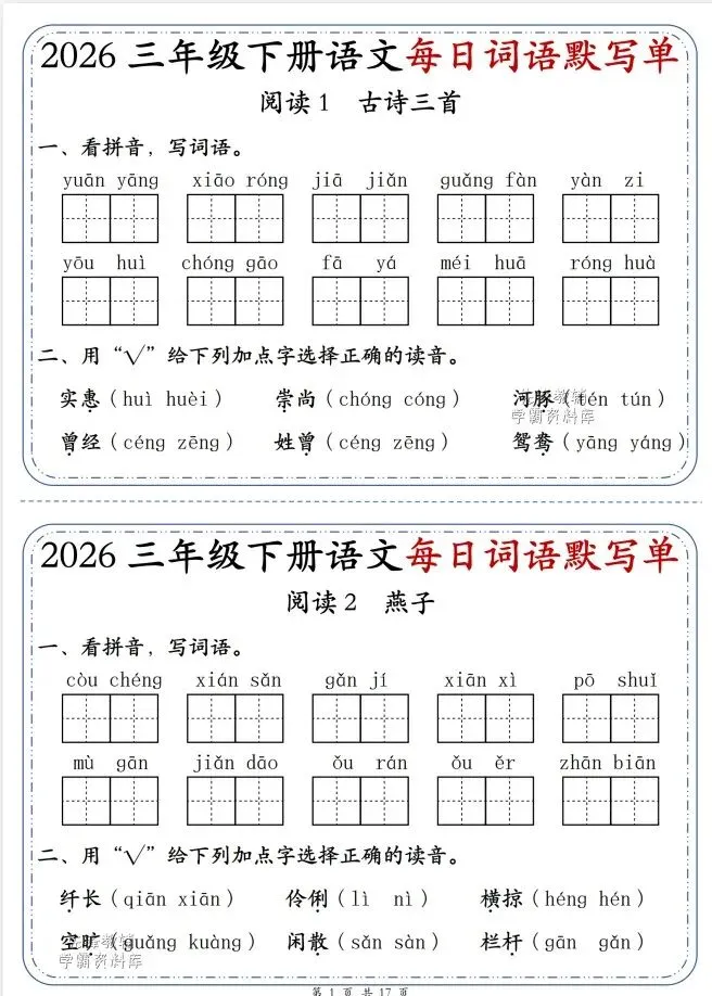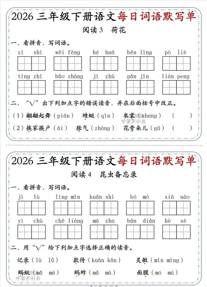 今天给大家整理了26春三年级语文下册每日词语默写单(前4单元),转发给朋友或班级群,受益更多人,帮助孩子学习!
