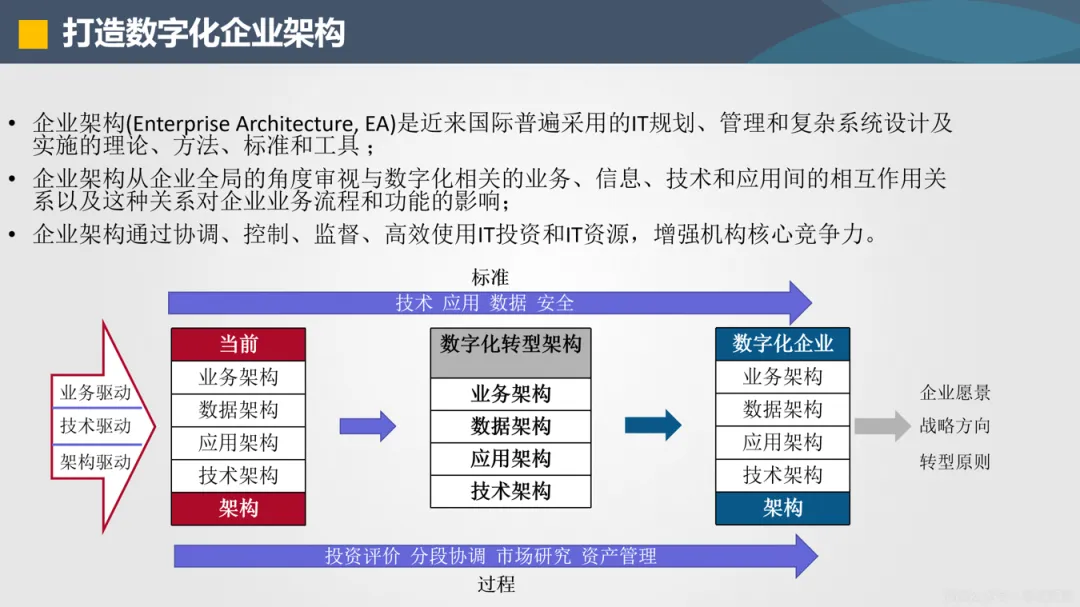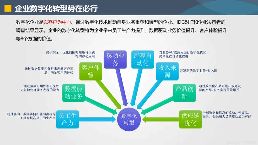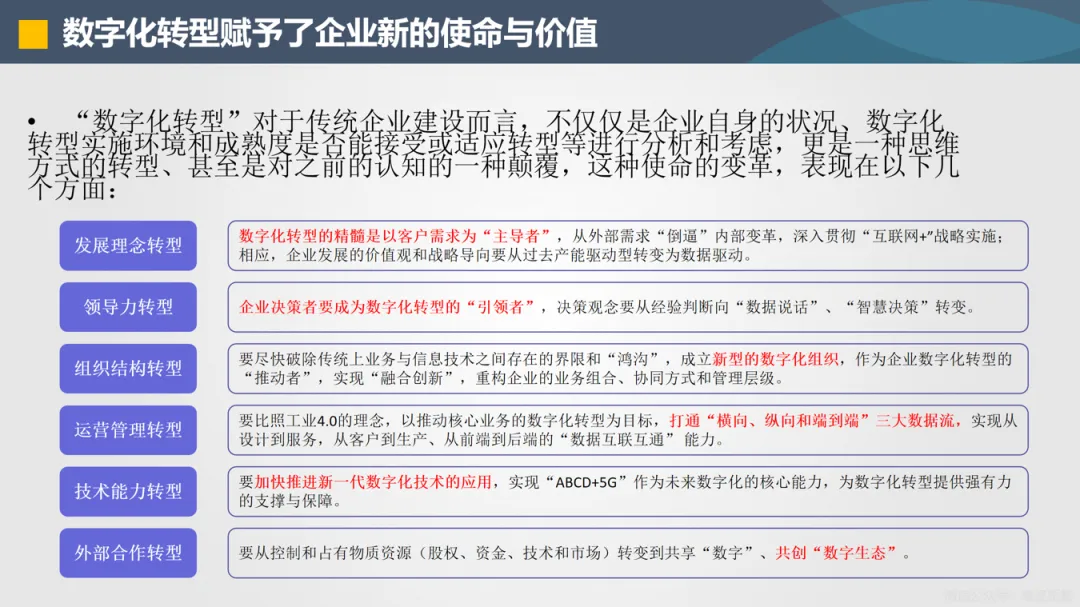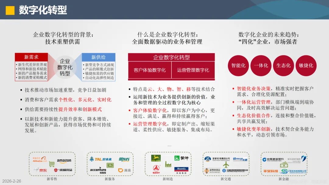 数字化转型是国家政策推动的重要方向,2020 年国资委已发文部署国企数字化转型工作。技术发展浪潮从主机时代迭代至人工智能认知时代,供需关系被技术重塑,消费需求个性化、供给侧需提效创新,倒逼企业进行数字化变革。企业数字化转型是以全面数据驱动业务和管理为核心,融合云、大、物、智、移等技术,实现客户体验与运营管理全流程数字化,最终向智能化、一体化、生态化、敏捷化的 “四化” 企业发展。