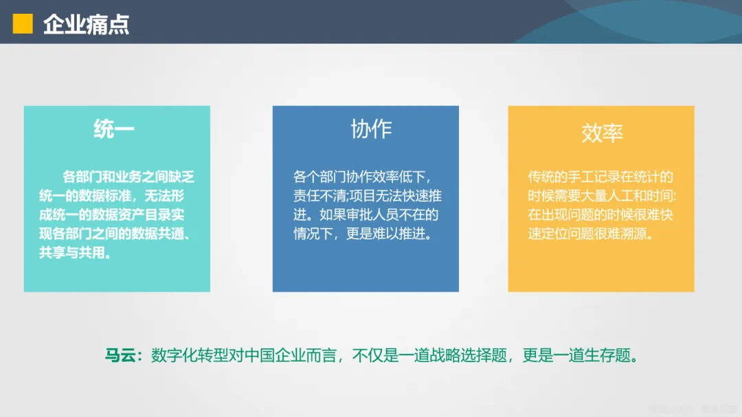 宏观层面,企业面临资金紧张、高地租高房租、高人工成本、原材料涨价、市场萎缩等问题;微观层面,管理粗放,存在库存记录不准、纸单工作效率低、信息传递滞后等问题。同时企业内部还存在数据标准不统一、部门协作效率低、人工统计溯源难的核心痛点,且数字化转型还面临投入成本高、短期见效难、操作复杂、服务不到位的实施阻碍。