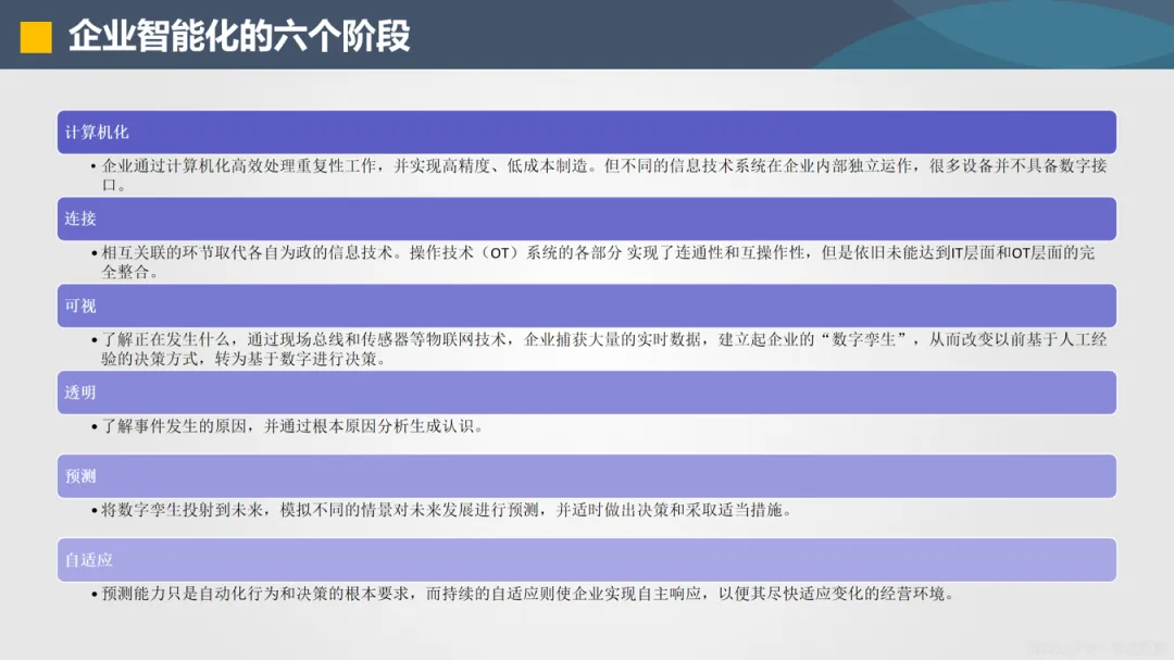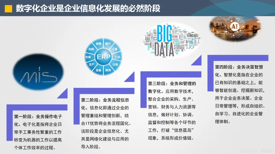 企业信息化发展分为四个阶段,从业务操作电子化、业务流程信息化,逐步走向业务和管理数字化、业务决策智慧化。数字化转型则分为六个阶段,从传统运营到创新并适应,企业需逐步完成从被动尝试到主动战略布局,最终形成数字化生态。而企业智能化建设也需历经计算机化、连接、可视、透明、预测、自适应六个阶段,实现从人工决策到自主响应的升级。