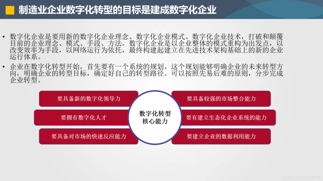 企业需具备数字化领导力、数字化人才储备、市场快速反应能力、市场整合能力、生态化系统构建能力和数据利用能力六大核心能力。同时要规避五大误区:勿将数字化解决方案过早作为业绩增长点、勿让信息化部门单独承担转型重任、勿认为引进工具即完成转型、勿忽视数据治理、勿期待转型立竿见影。