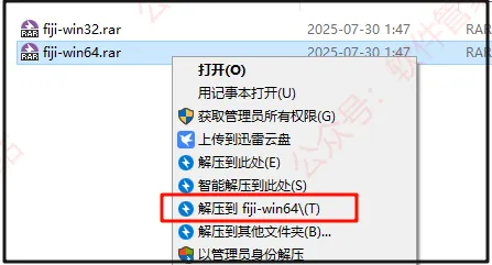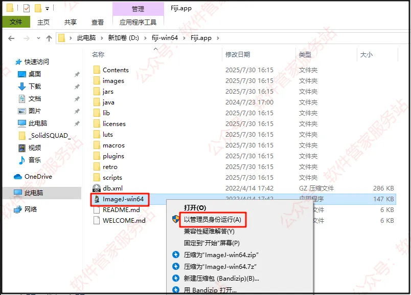 第三步:打开解压后的文件夹,找到【ImageJ-win64】,右击【以管理员身份运行】。