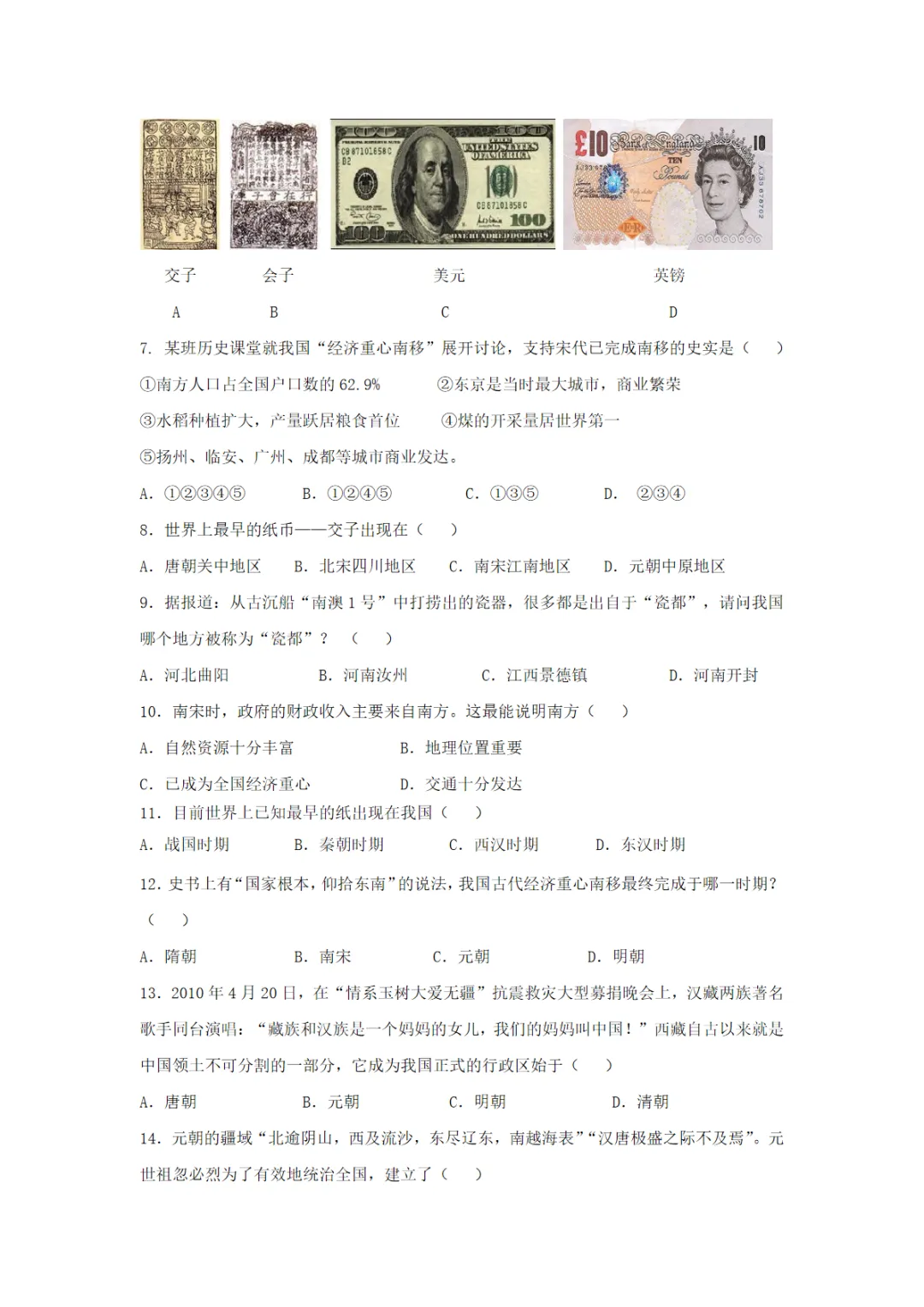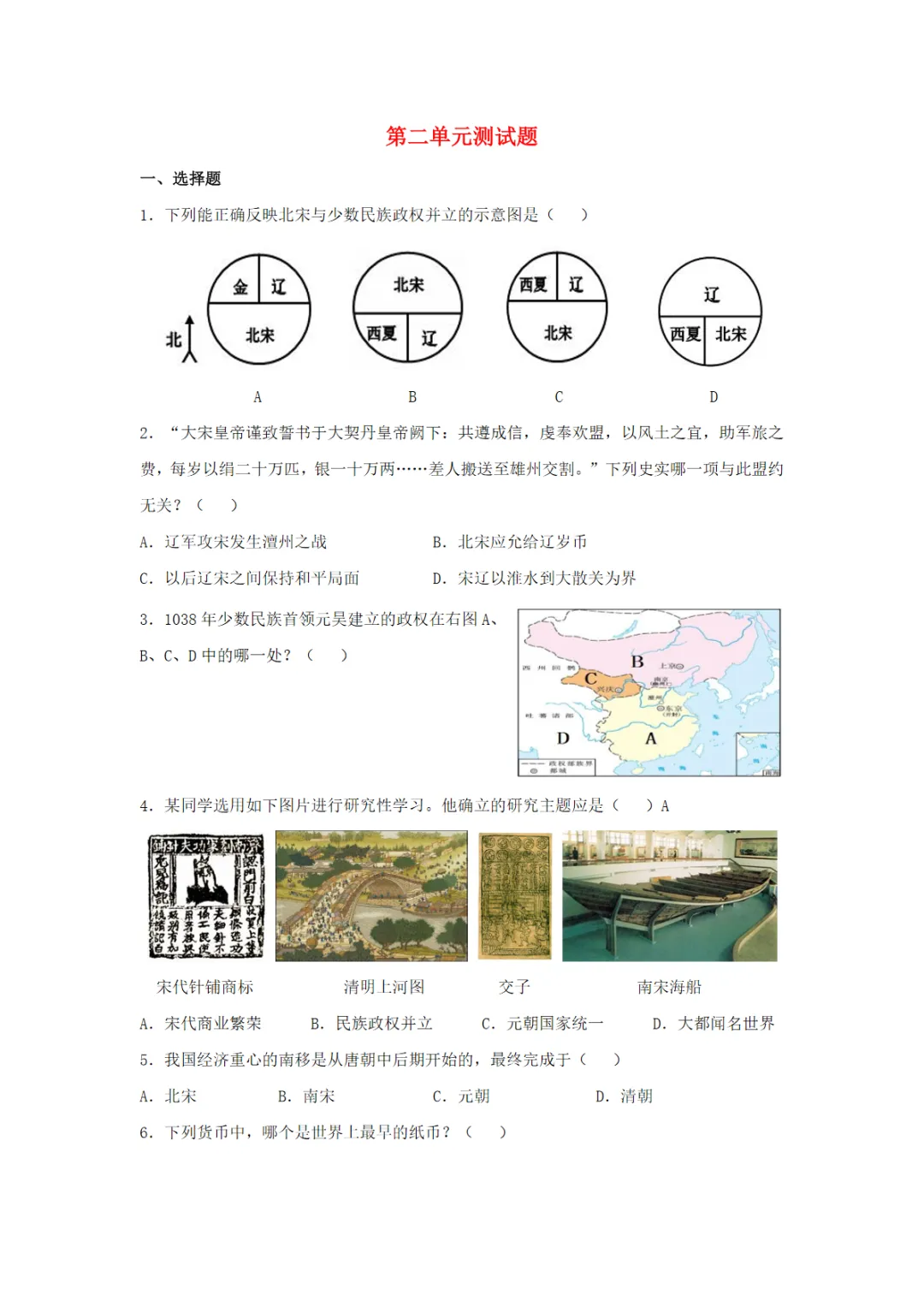七年级(下)历史 第二单元辽宋夏金元时期:民族关系发展和社会变化测试卷