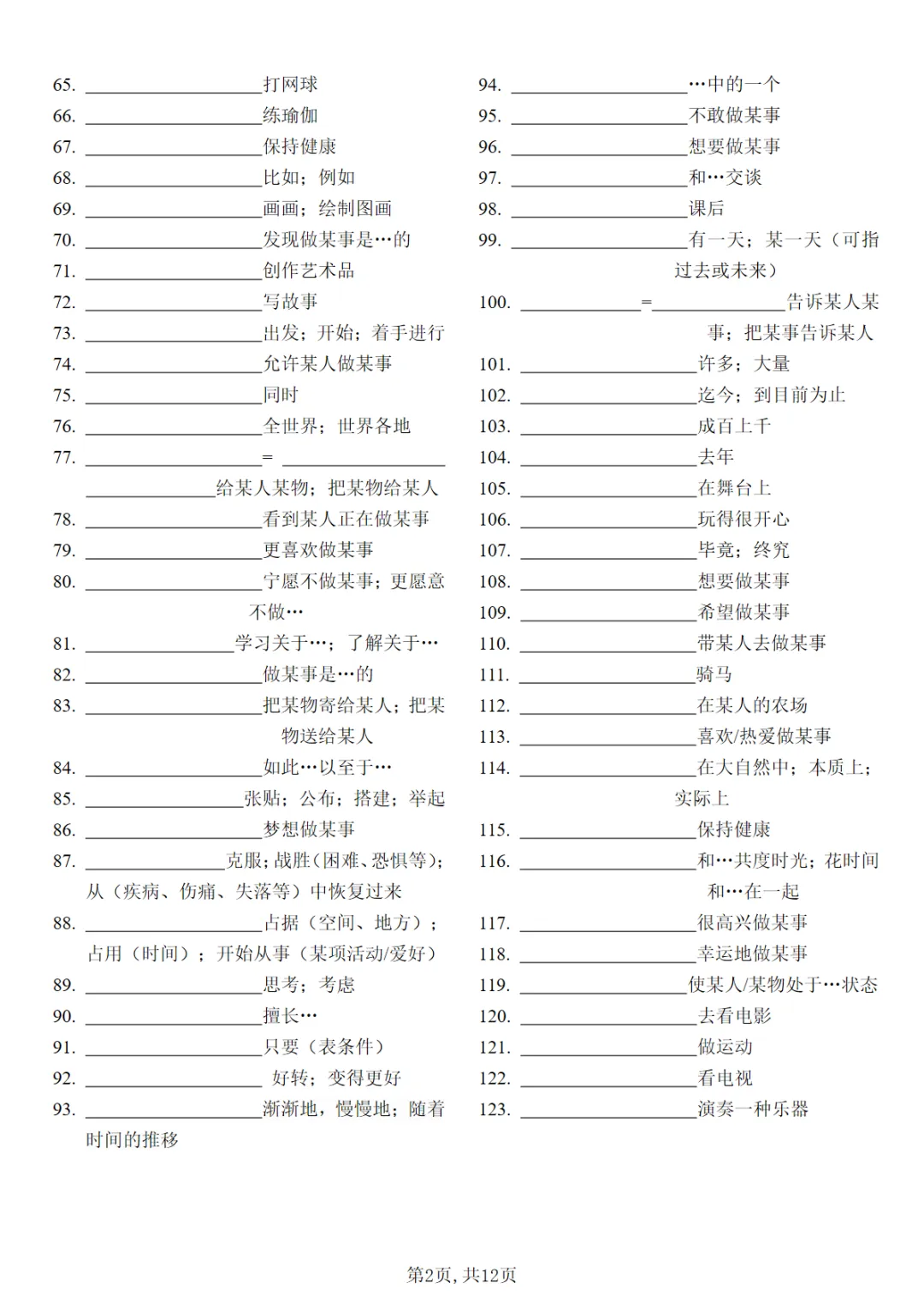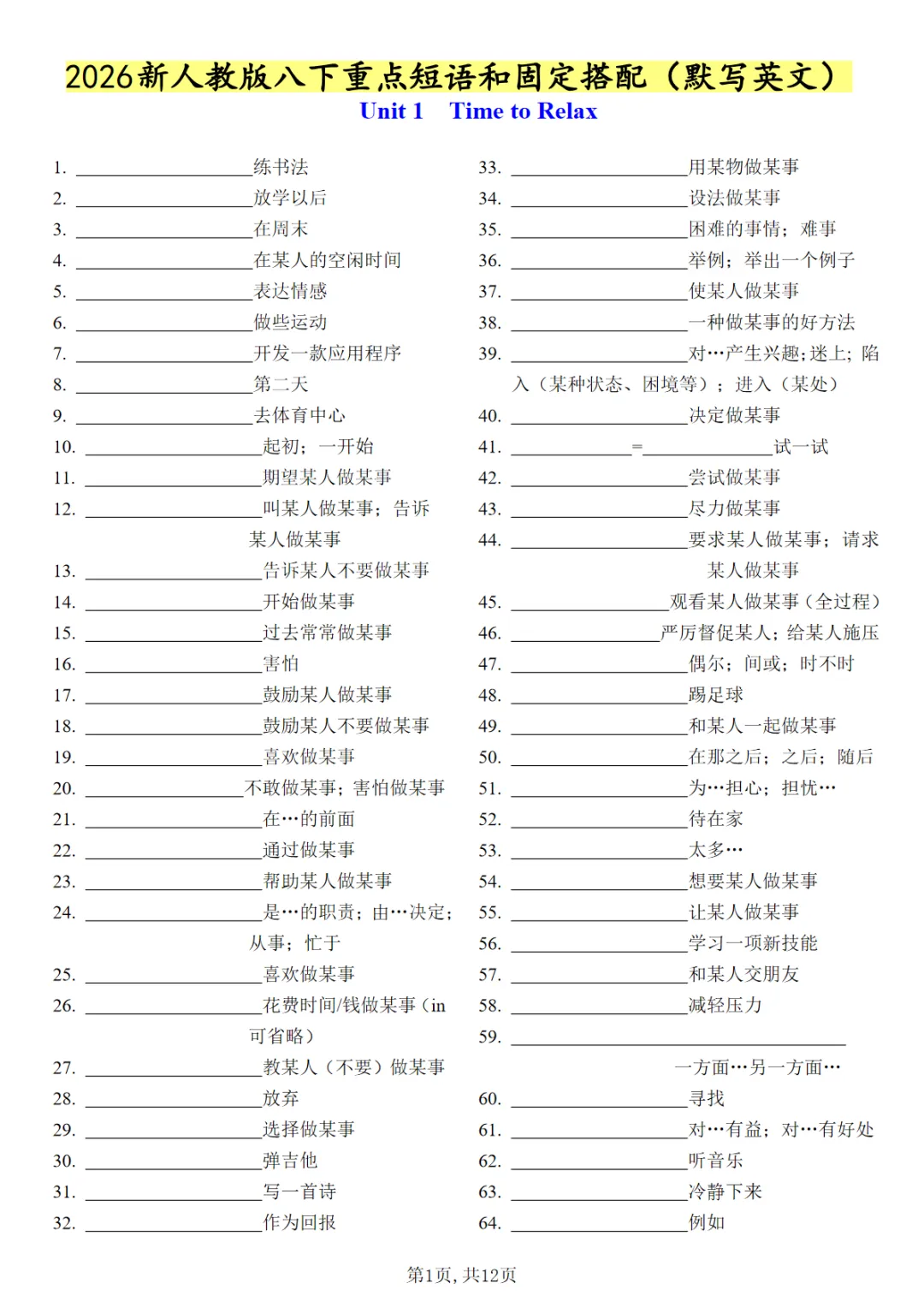 八年级(下)英语 26春重点短语及固定搭配-(默写英文)《人教版》