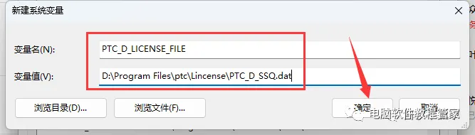 8、新建系统变量。变量名:PTC_D_LICENSE_FILE