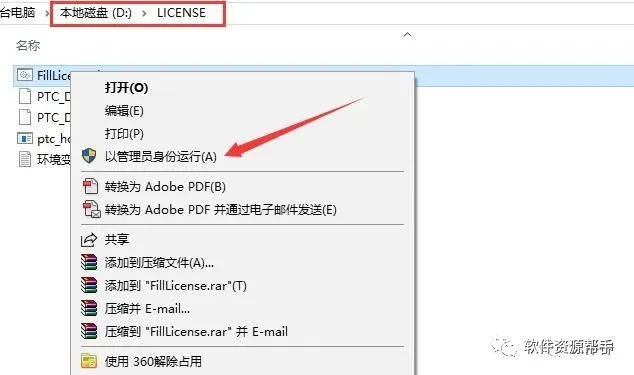3.将刚刚复制的文件,粘贴到D盘根目录,打开LICENSE文件夹,右键以管理员的方式运行FilLicense.bat程序