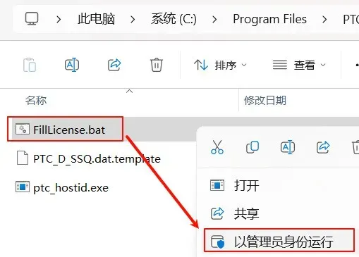 5.依次打开"C:\Program Files\PTC LICENSE"文件夹,选中"FillLicense.bat"右键选择以管理员身份运行