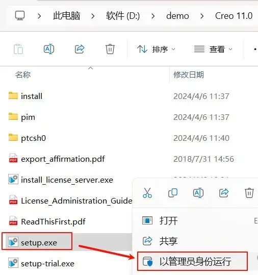 9.选中"setup.exe"右键选择以管理员身份运行