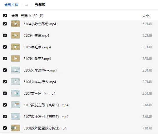 01 两个对象容斥 02 文氏图 03 多位数巧算加减法 04 多位数乘法凑整 05 小数乘法运算规则06 乘积近似数 07 小数点移动 08 除数是小数 09 牛吃草 1 10 牛吃草 211 牛吃草 3 12 火车过桥 13 火车与行人 14 数长方形 15 数正方形16 数三角形 17 数阵图重数分析法 18 分段计算行程问题 19 小数加减法 20 小数乘除法21 乘法分配律 22 提取公因式 23 分段计费 24 简单的解方程 25 列方程解决问题26 标数法 27 简单染色问题 28 分段行程中的倍数关系 29 分割法求面积 30 等积变形31 狗牙模型 32 蝴蝶模型 33 环形周期相遇 34 环形周期一般问题 35 环形周期追及36 方阵的基本性质 37 空心方阵 38 积分胜负 39 连线对阵图 40 分数认识41 扩分,约分,通分 42 一般分数加减 43 长方体与正方体 44 正方体展开图 45 割补法46 公式法格点面积 47 流水行船 48 流水行船 2 49 整除的概念 50 尾数判别51 分解判别 52 质数与合数 53 分解质因数 54 完全分拆 55 不完全分拆56 位值原理 57 工程问题之水管问题 1 58 工程问题之水管问题 2 59 工程问题水箱 3 60 复合比 161 乘法复合比 2 62 除法复合比 3 63 列表分析 4 64 分数正反比 65 正反比基本概念66 正反比简单应用 67 齿轮问题 68 正反比中途变速 69 行程问题中的比例关系 70 行程问题 271 行程问题 3 72 行程问题 4 73 打折问题 74 经济问题 75 经济问题设份数76 列表分析 77 上楼梯递推 78 直线分图面 79 传球法 1 80 传球法 281 传球法 3 82 插空法 83 插板法 1 84 插板法 2 85 方块图计数86 扶梯问题 87 空中加油问题 88 往返接送问题 89 最佳会合点问题